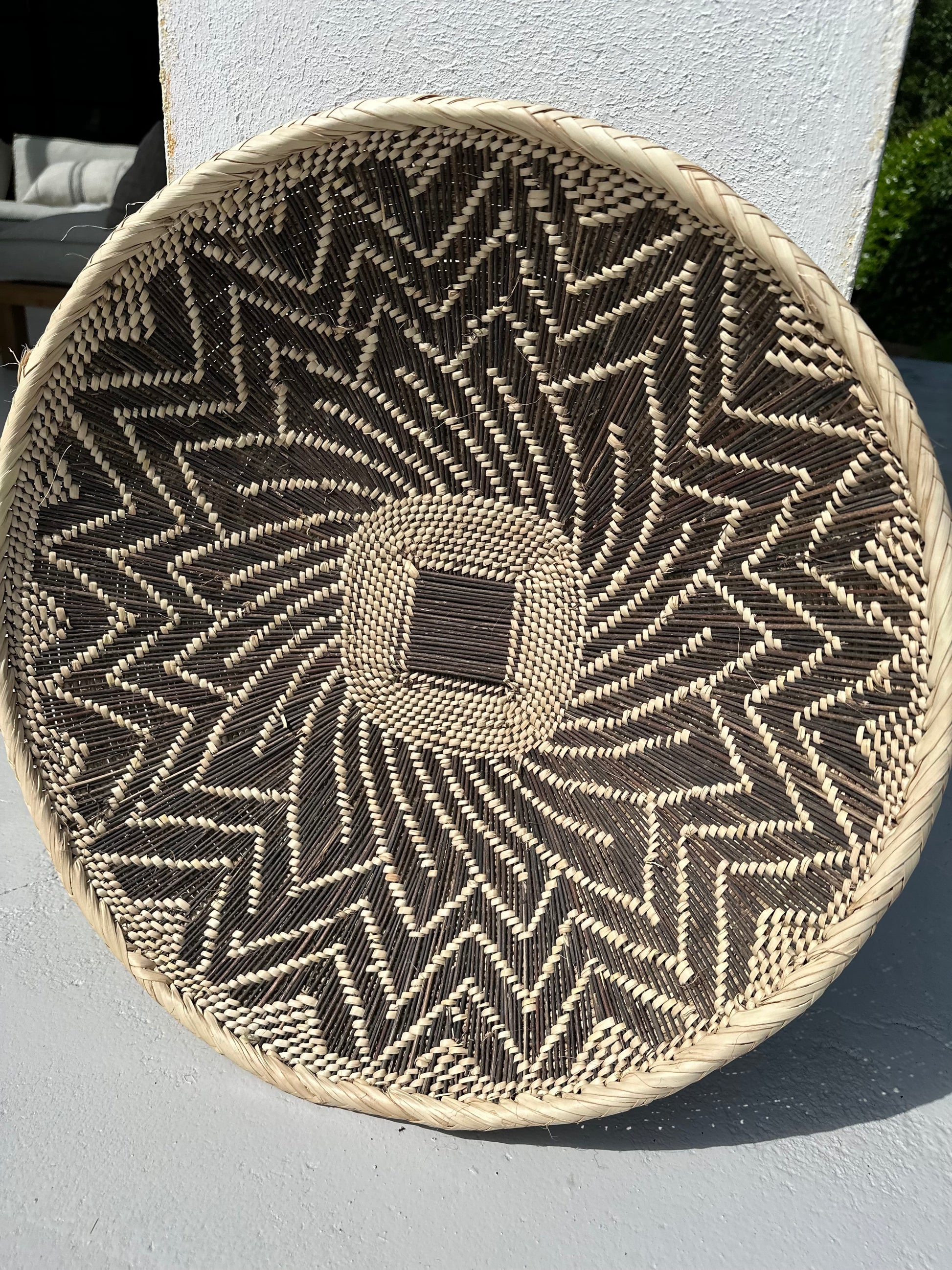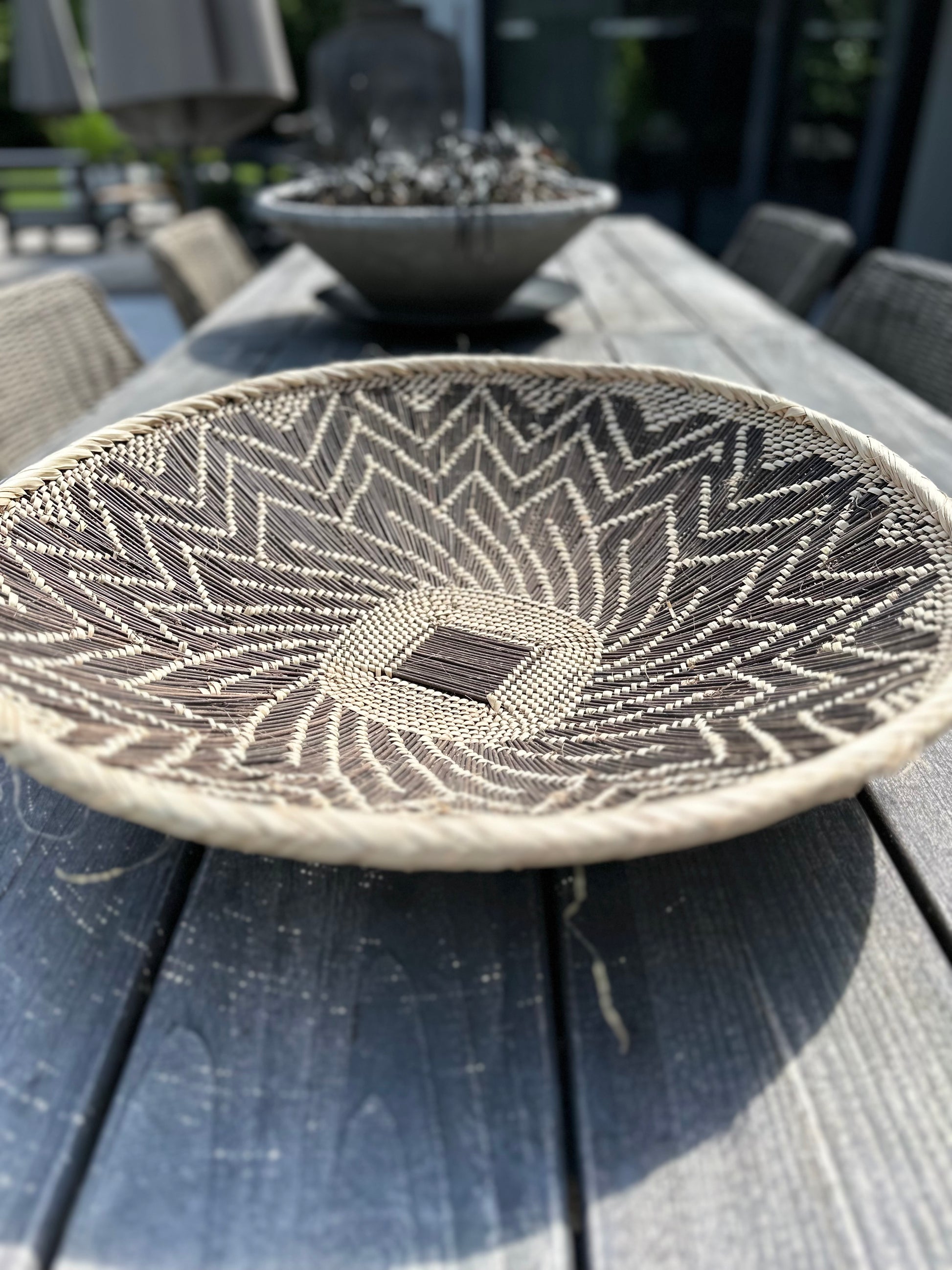De gedetailleerde en unieke patronen van de mand maken het een waar kunstobject voor aan de muur. Ook voor op tafel is deze sierlijke mand met een doorsnede van 55cm. een echte eyecatcher.