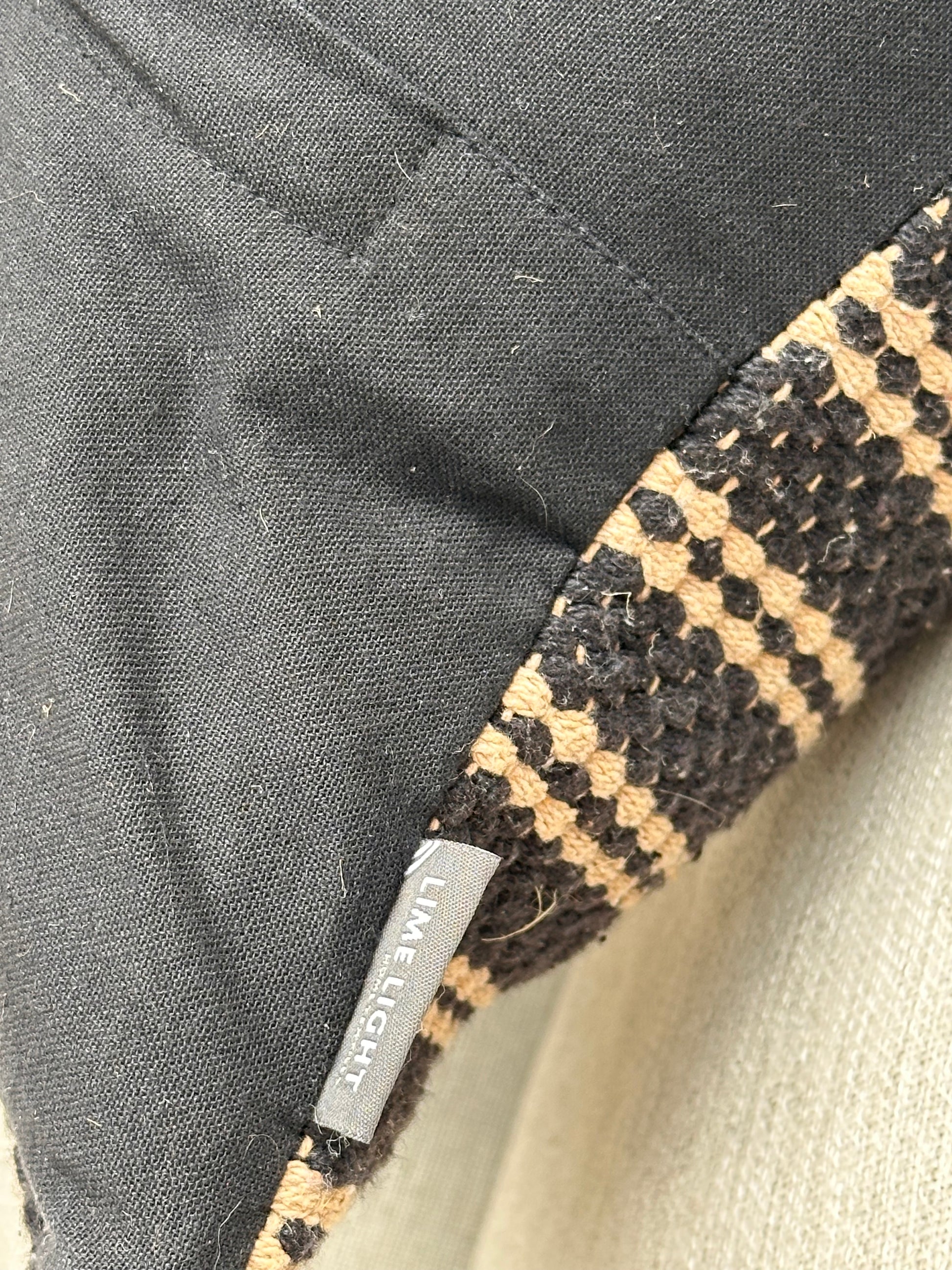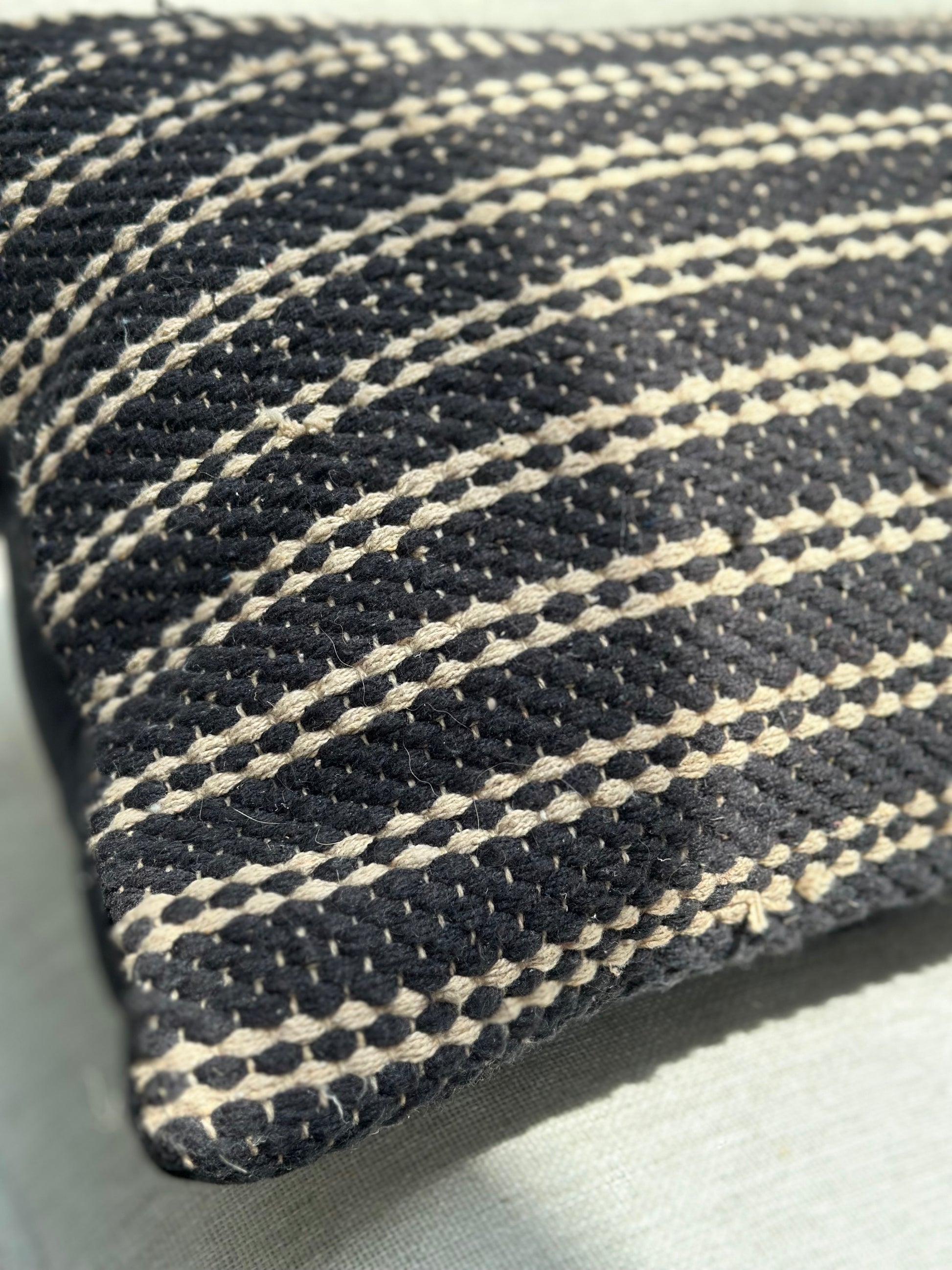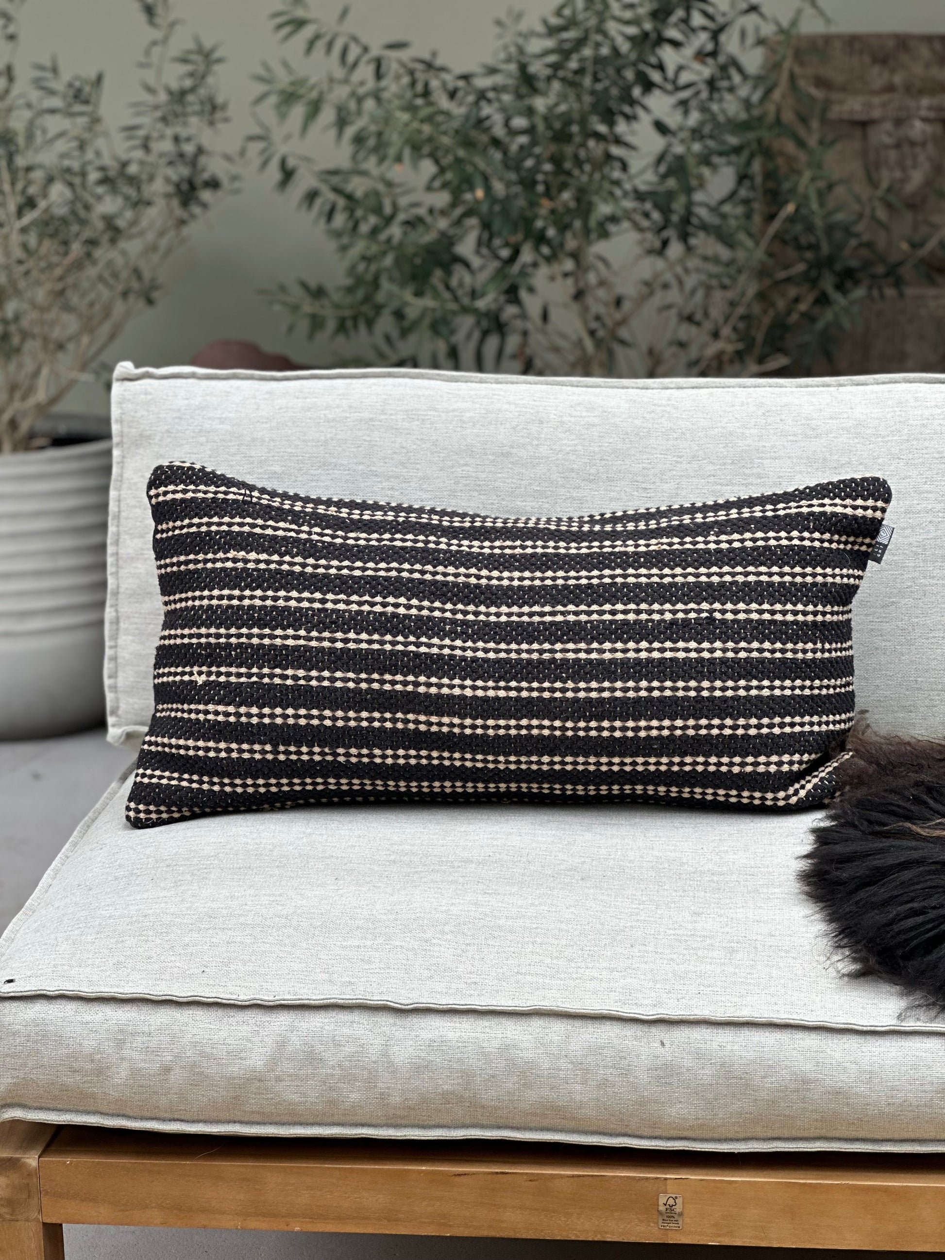 De combinatie van zwart en ecru maakt dit kussen makkelijk te combineren met andere tinten en texturen – of je nu een industrieel, landelijk of modern interieur hebt.