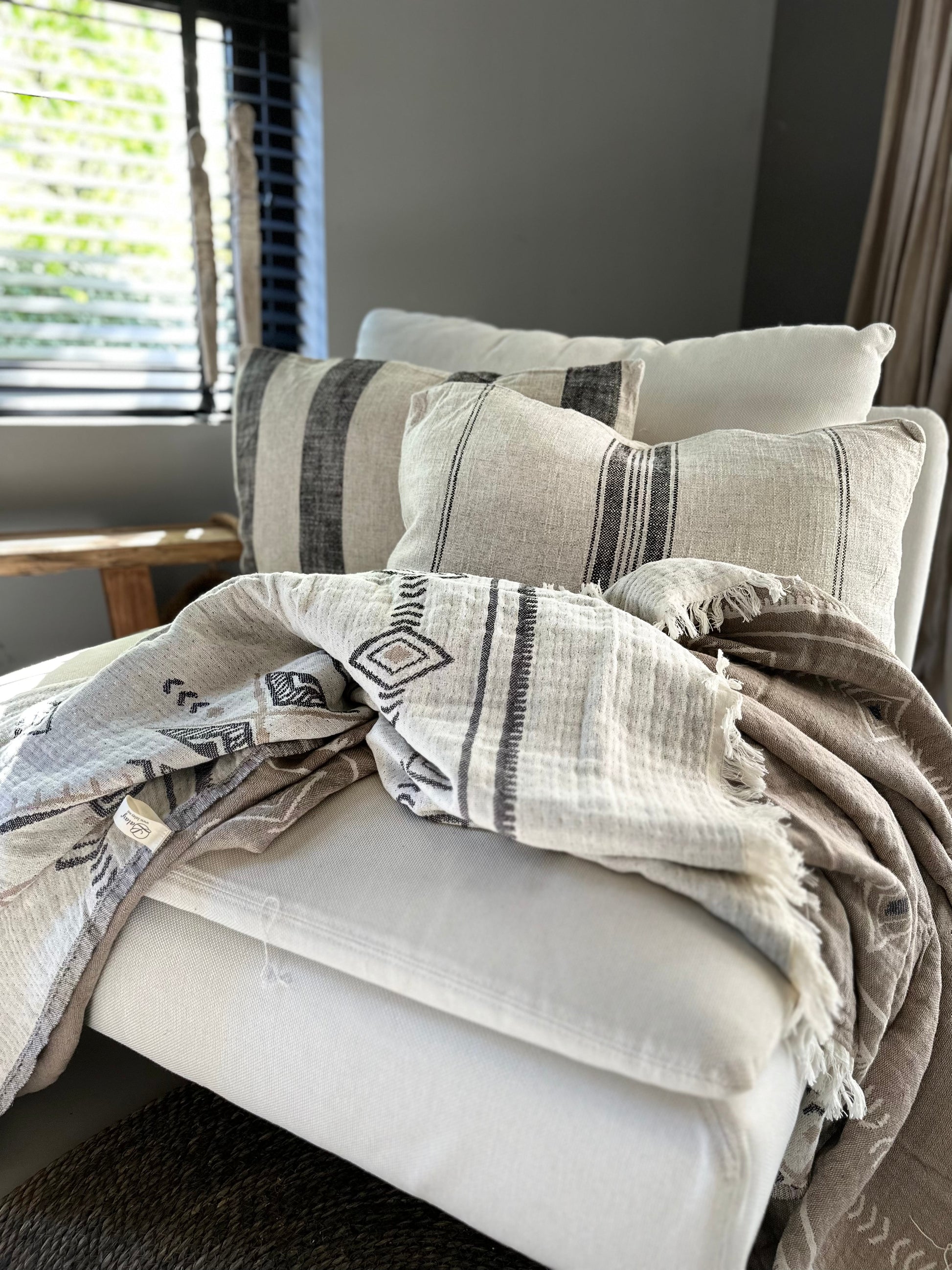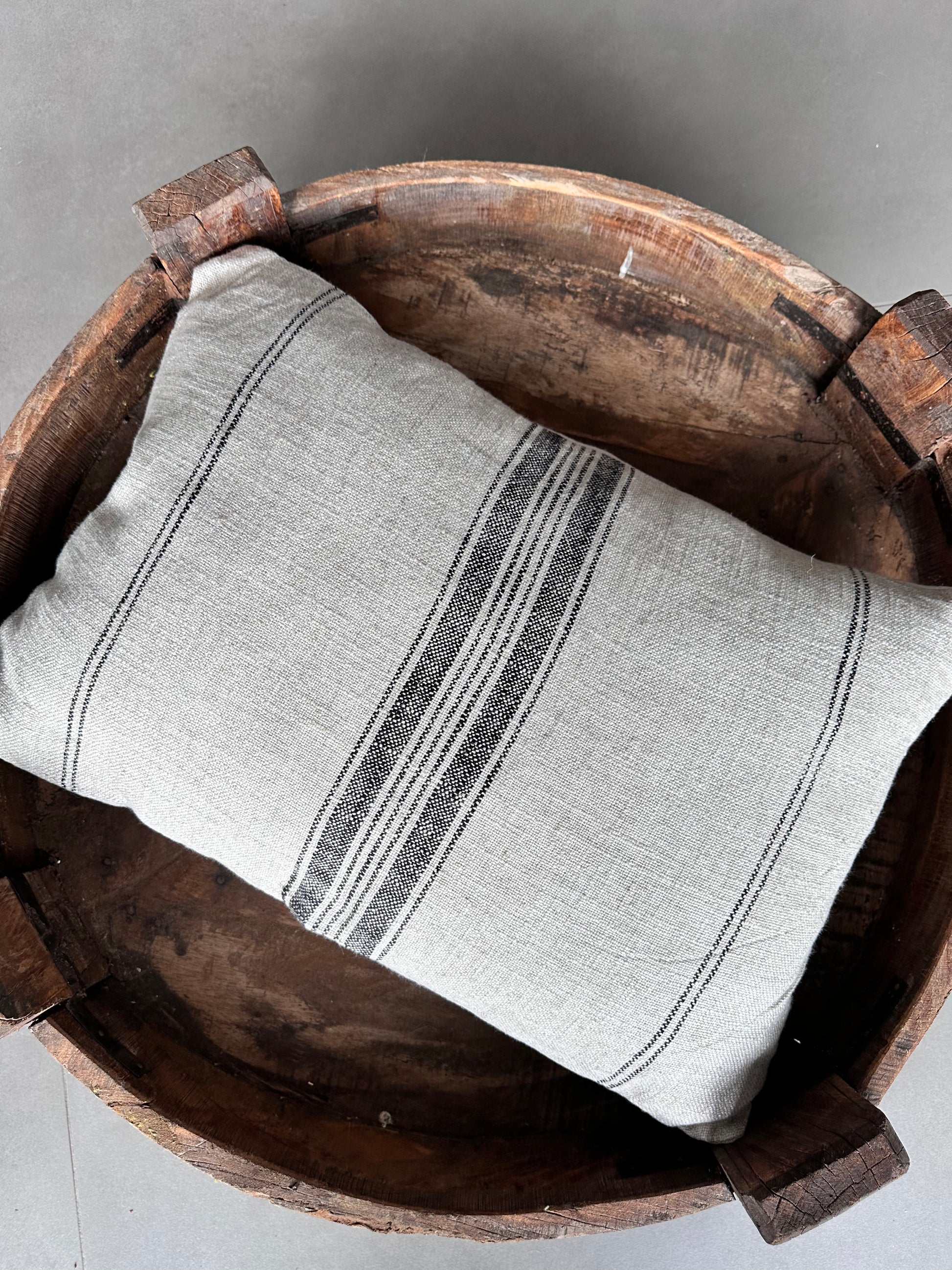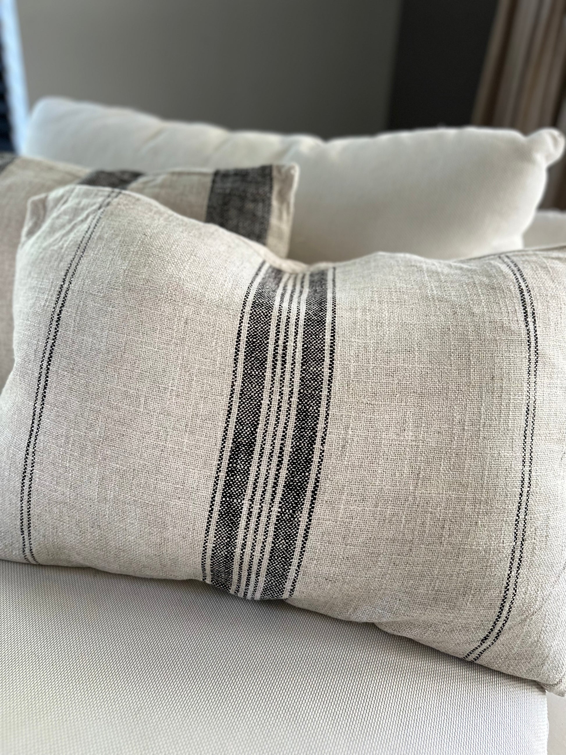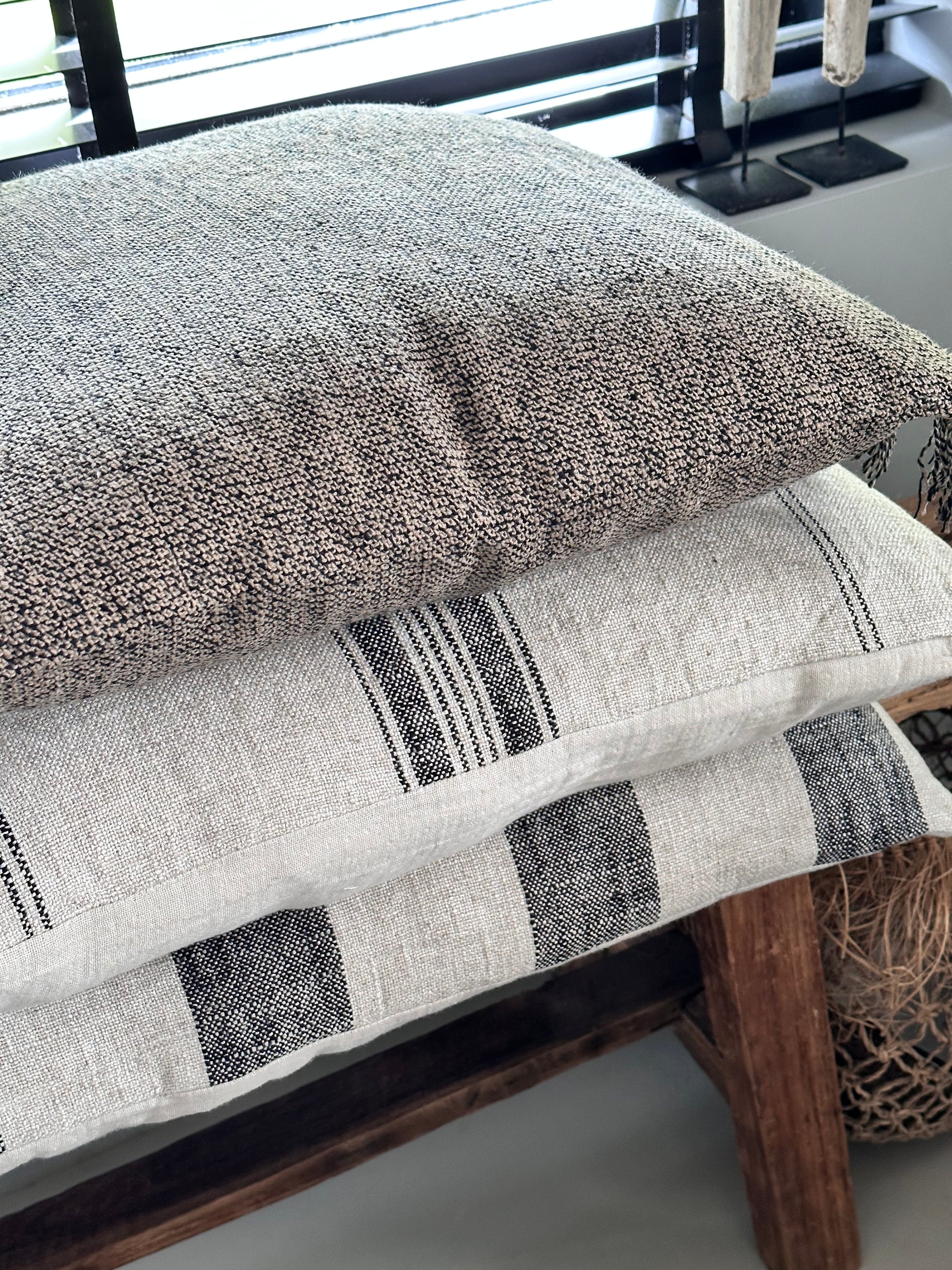 Dit sfeervolle kussen geeft je interieur net dat beetje extra! Fijne strepen in de kleur zwart met ecru. Het materiaal is van linnen en viscose en het binnenkussen is van polyester.