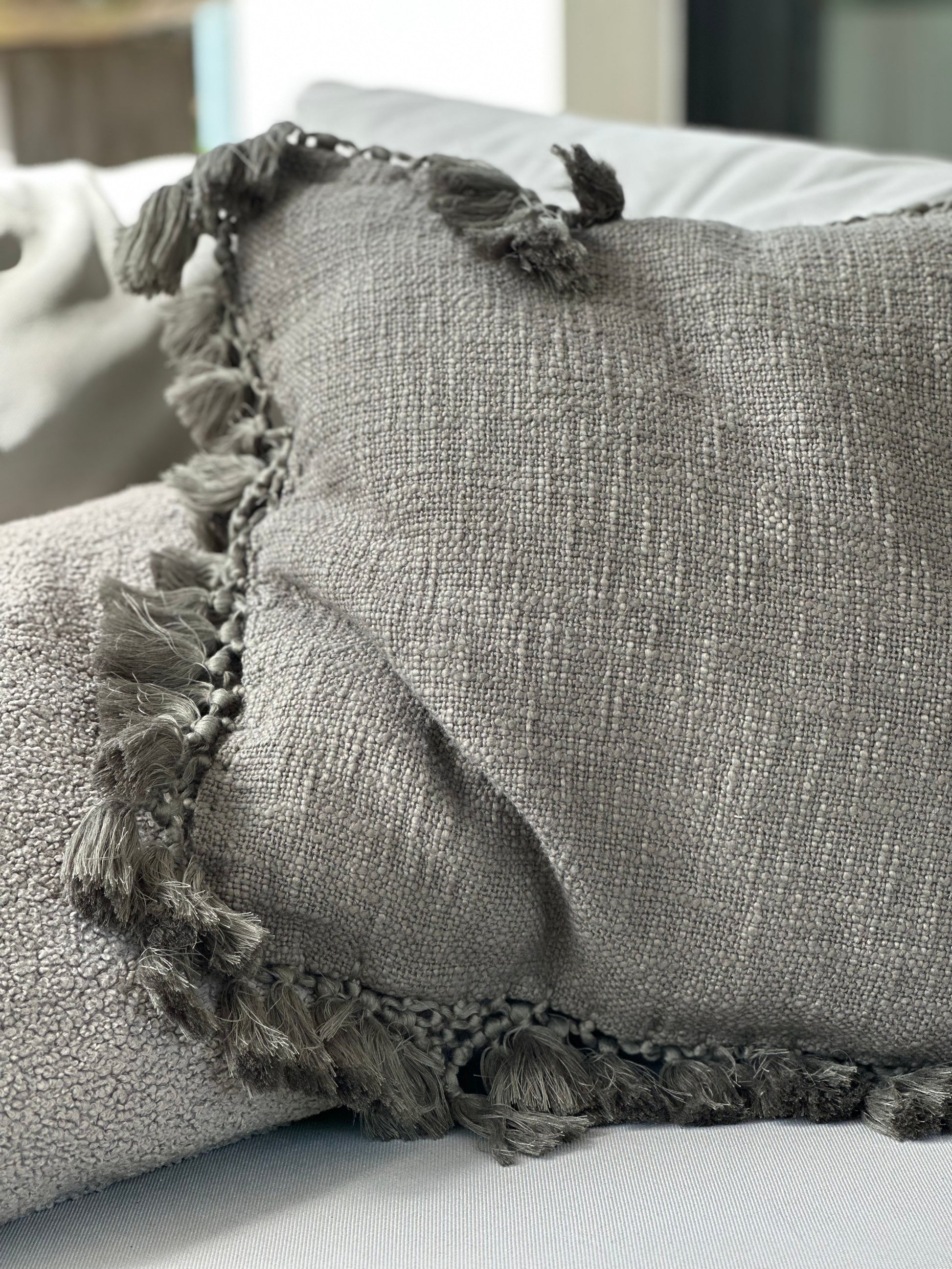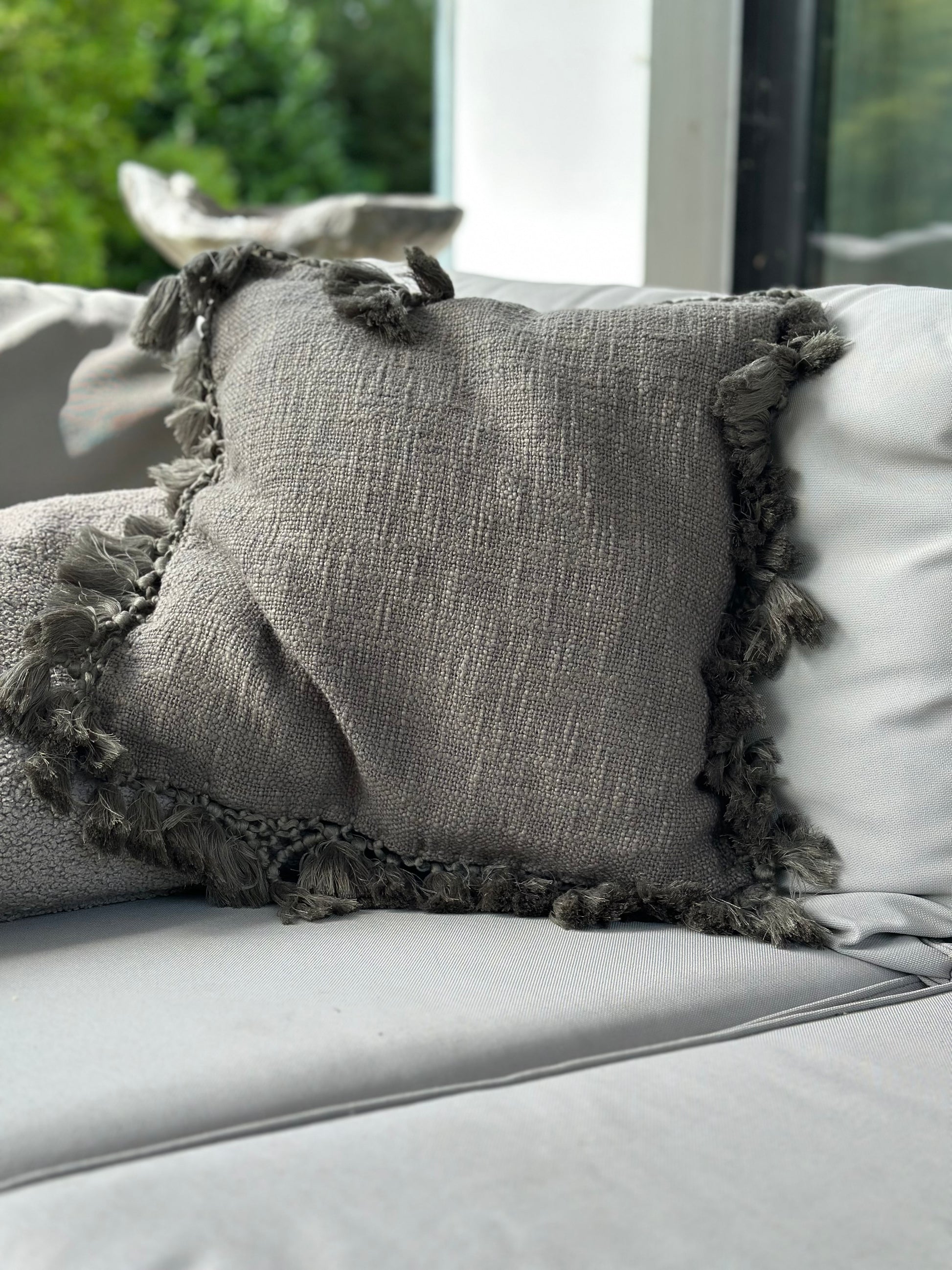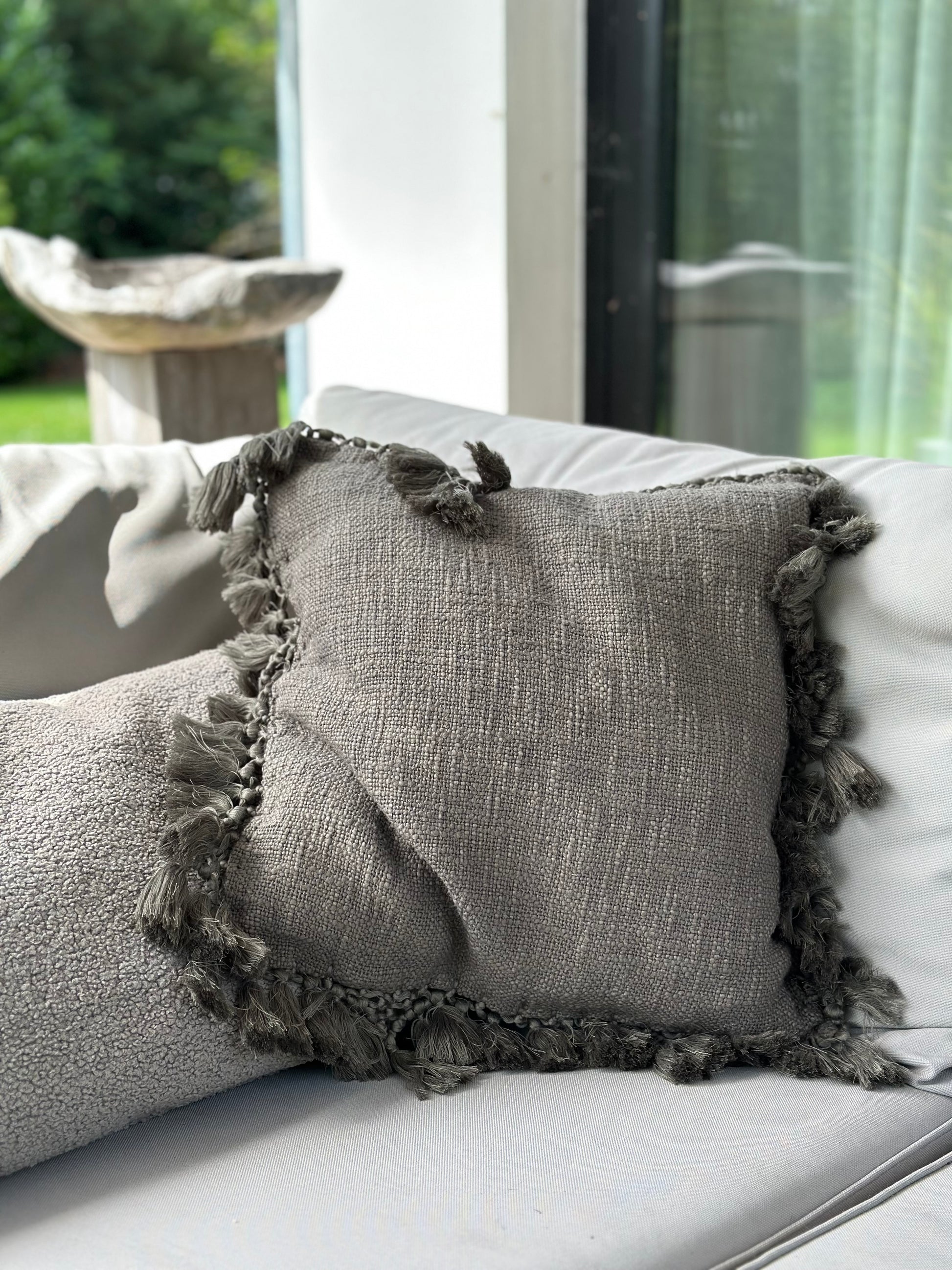 Breng een gevoel van rust in huis met dit prachtige kussen met een natuurlijke uitstraling. De zachte tint, grove structuur en pure materialen zorgen voor een warme, ontspannen sfeer waarbij de geknoopte rand met subtiele kwastjes een verfijnd detail geven.
