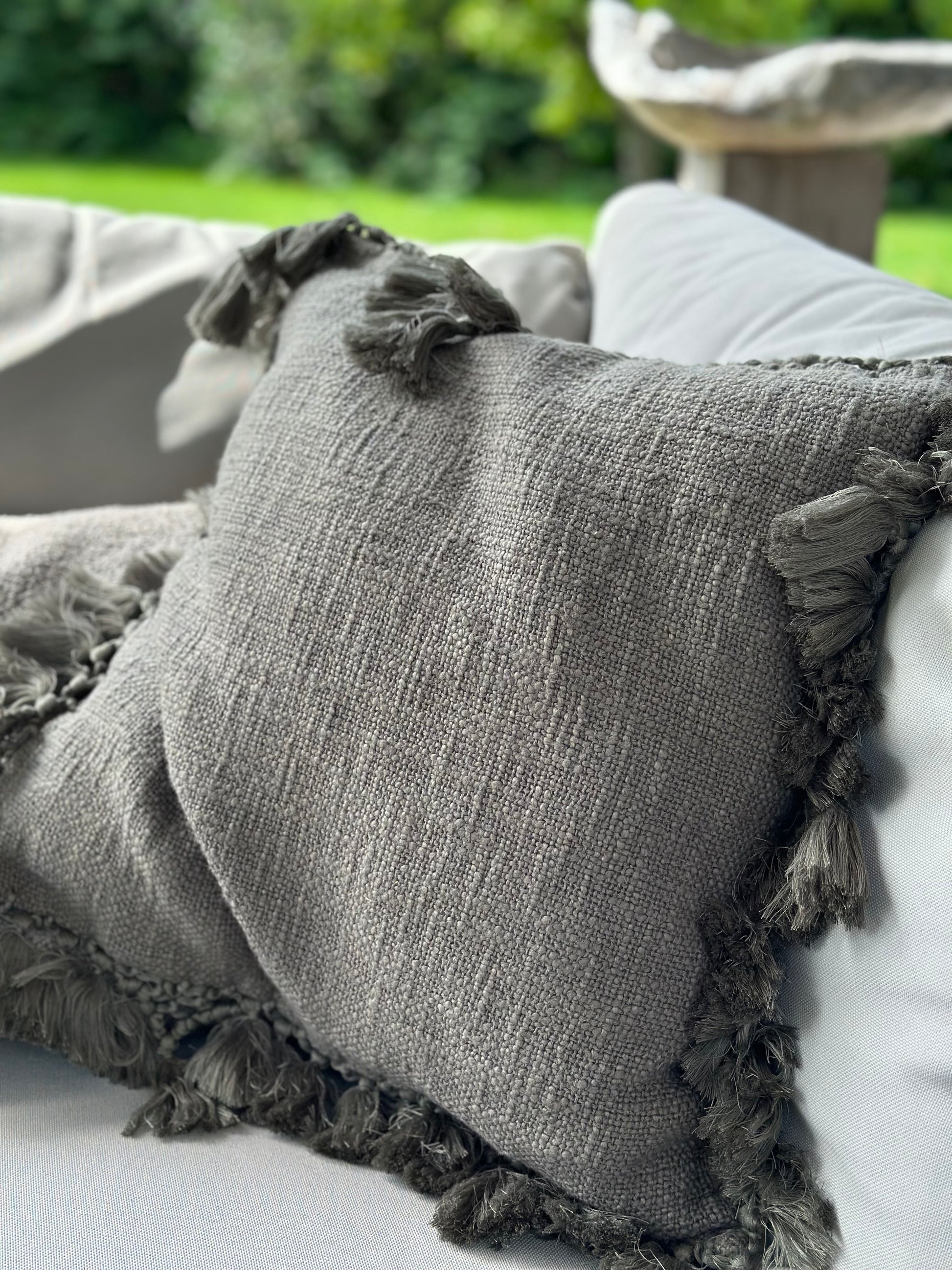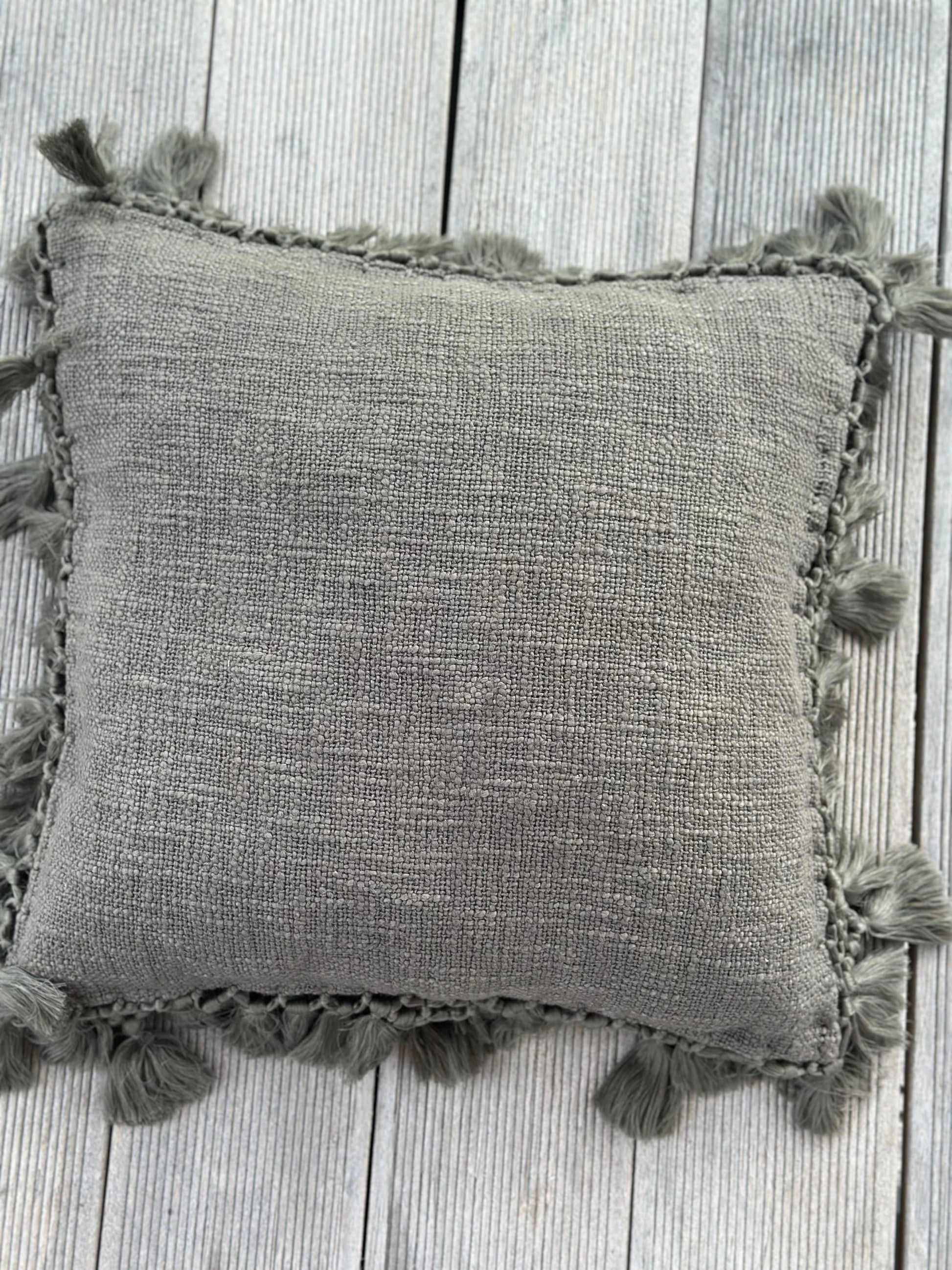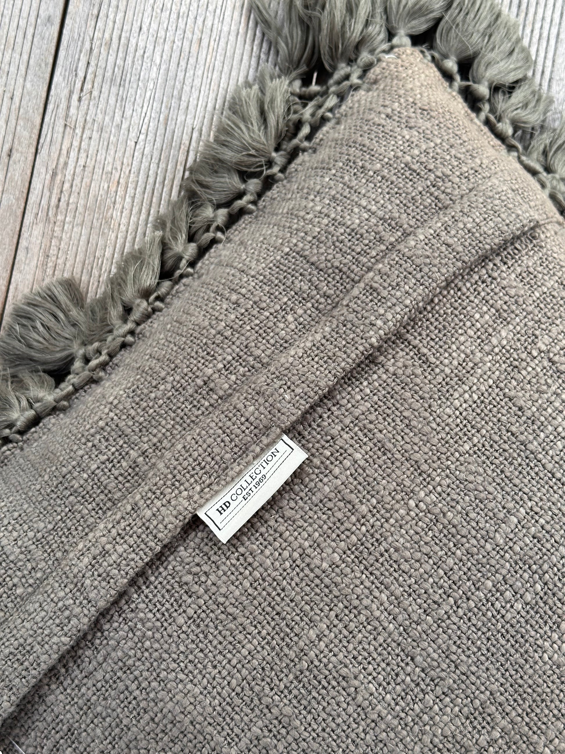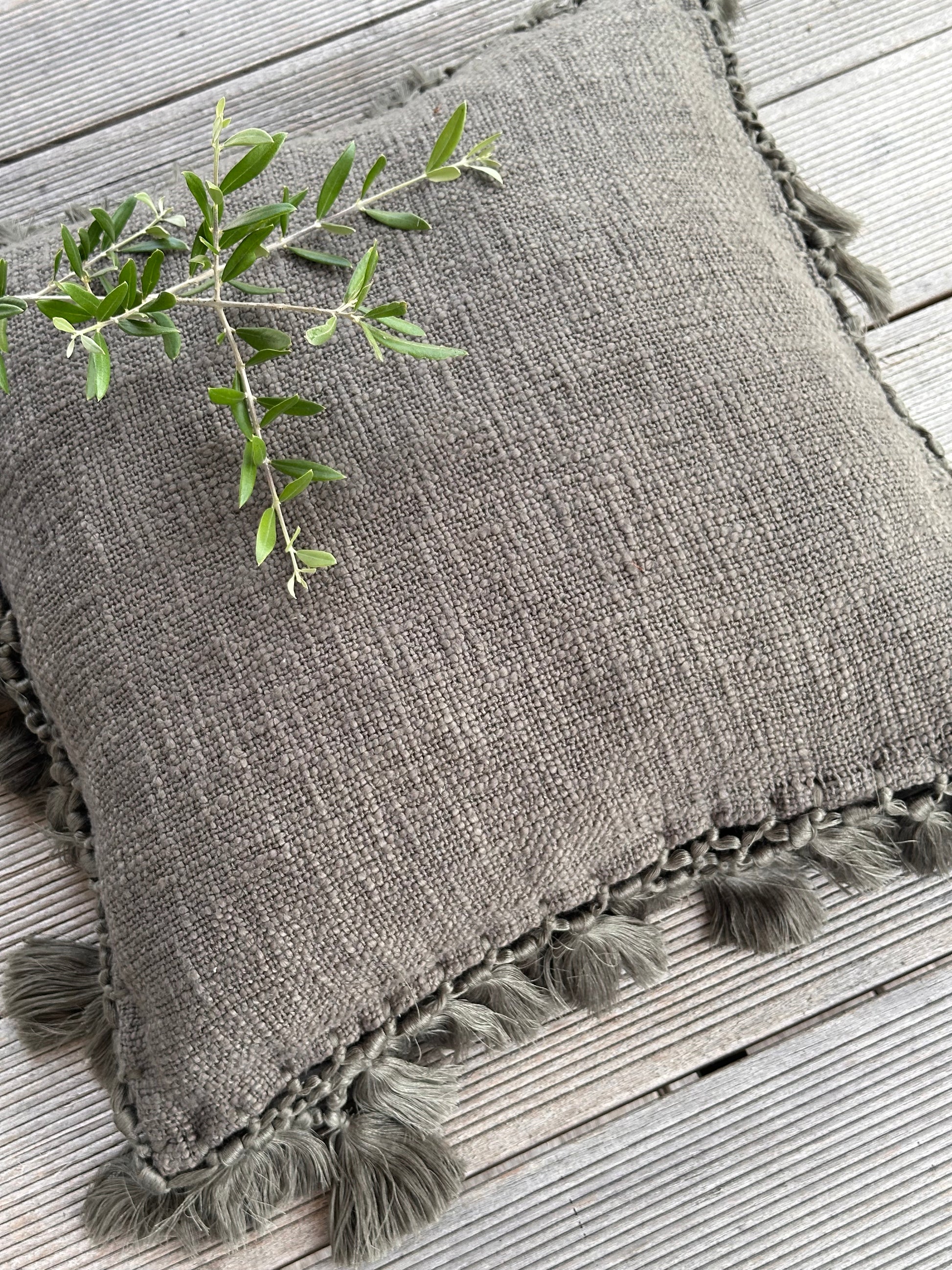 Breng een gevoel van rust in huis met dit prachtige kussen met een natuurlijke uitstraling. De zachte tint, grove structuur en pure materialen zorgen voor een warme, ontspannen sfeer waarbij de geknoopte rand met subtiele kwastjes een verfijnd detail geven.