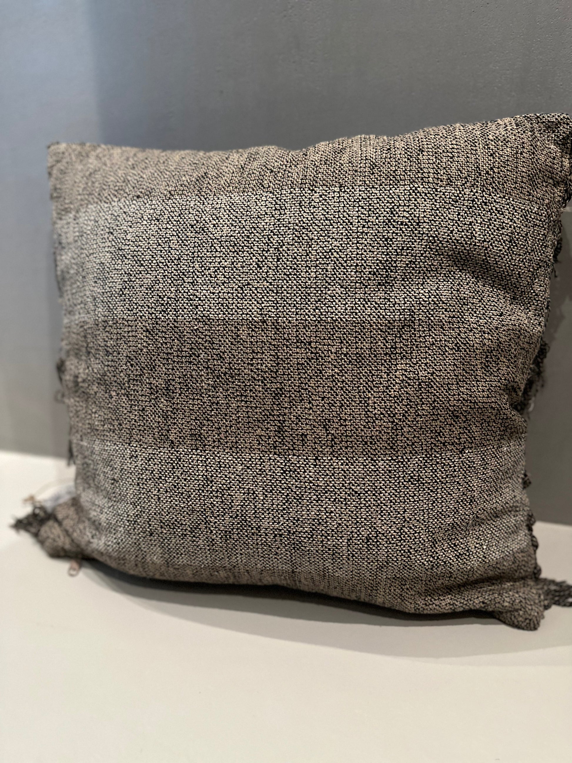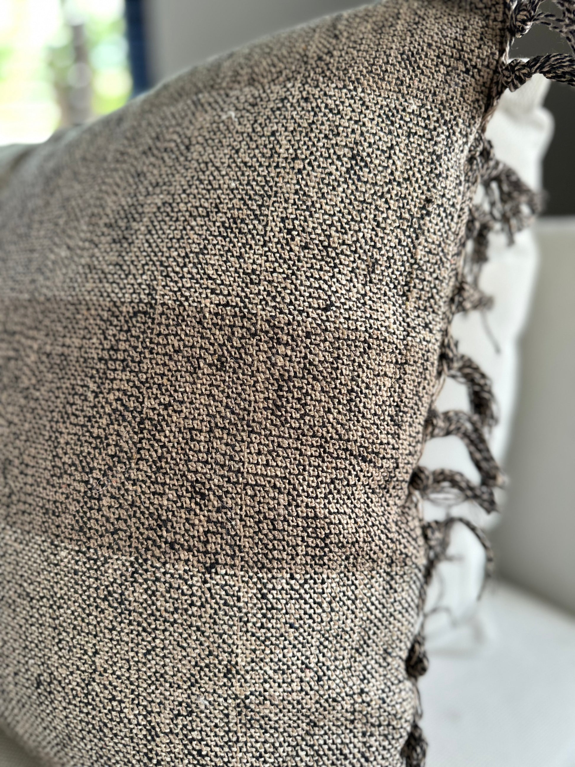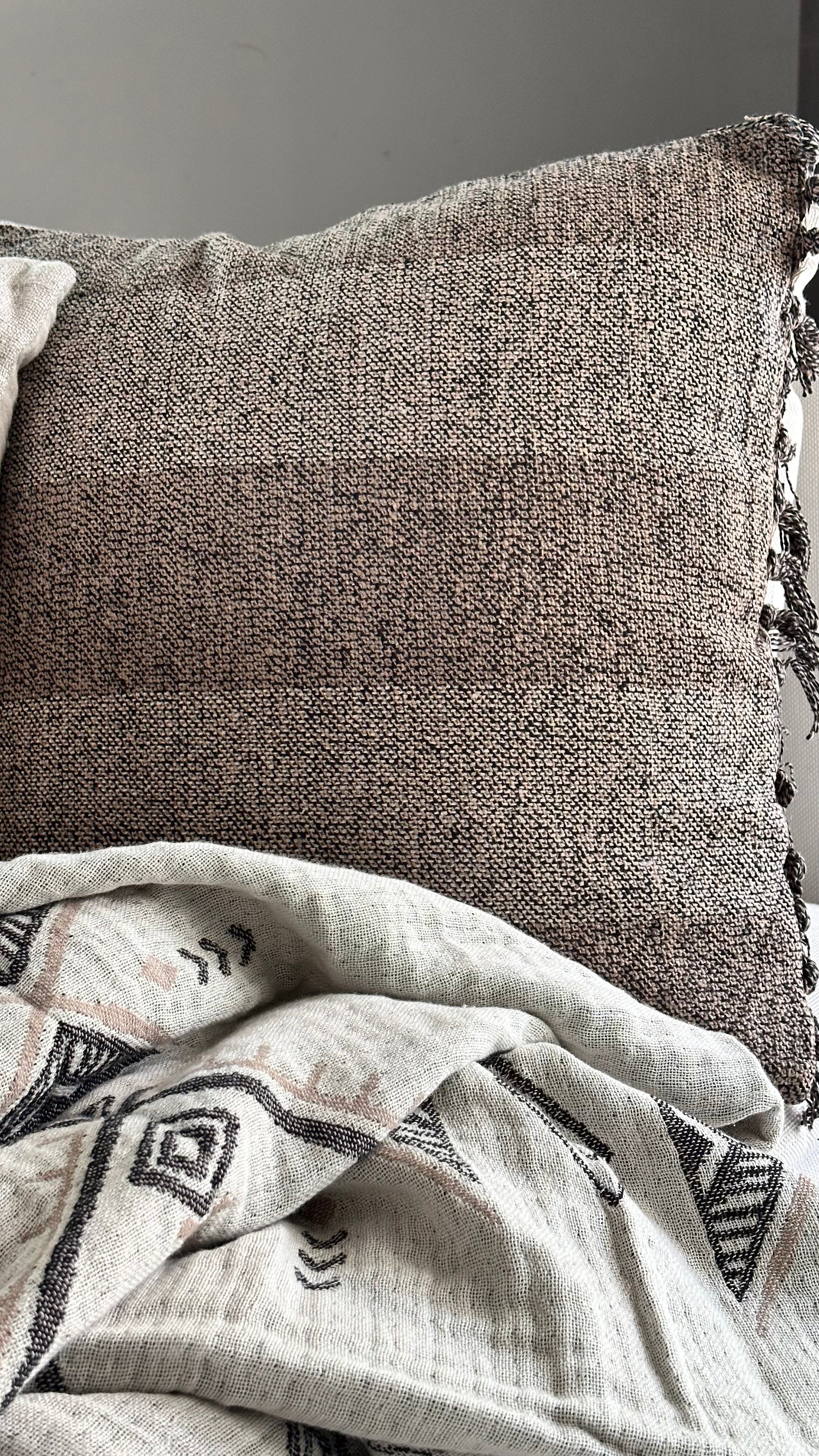 De bruin/grijze look geeft een warme toevoeging aan uw interieur. Het kussen heeft mooie franjes aan weerszijden. Maat 50x50cm.
