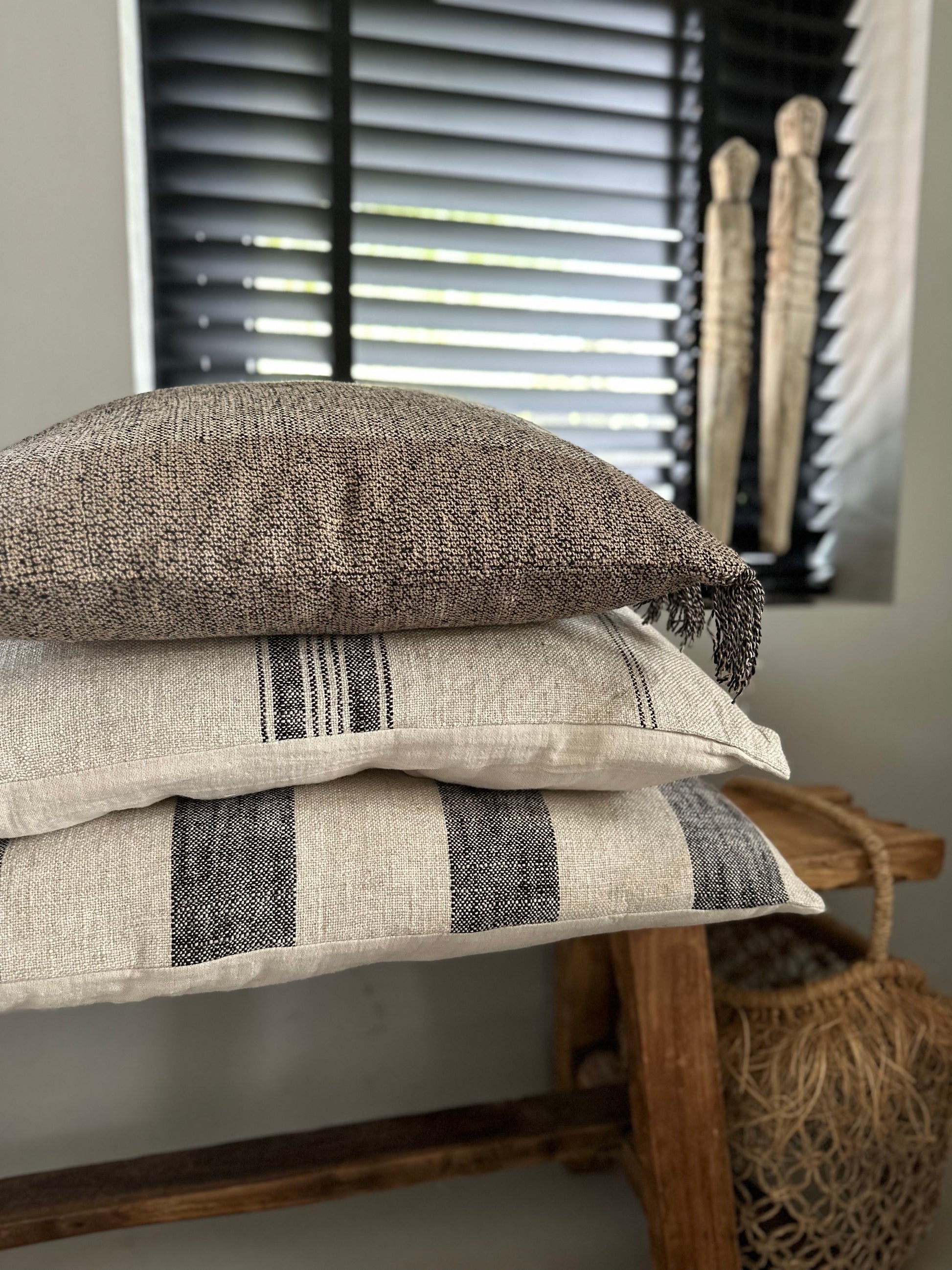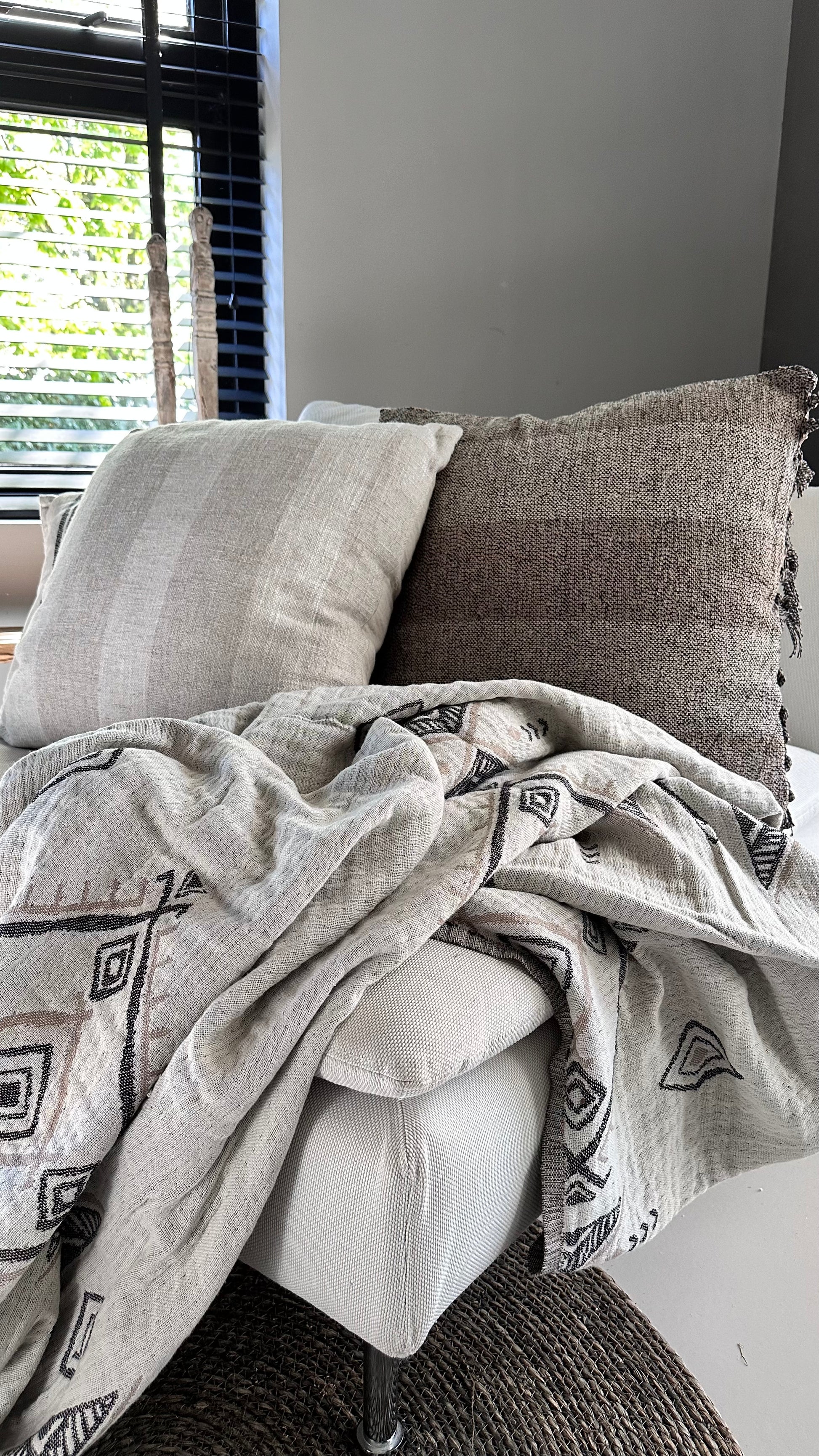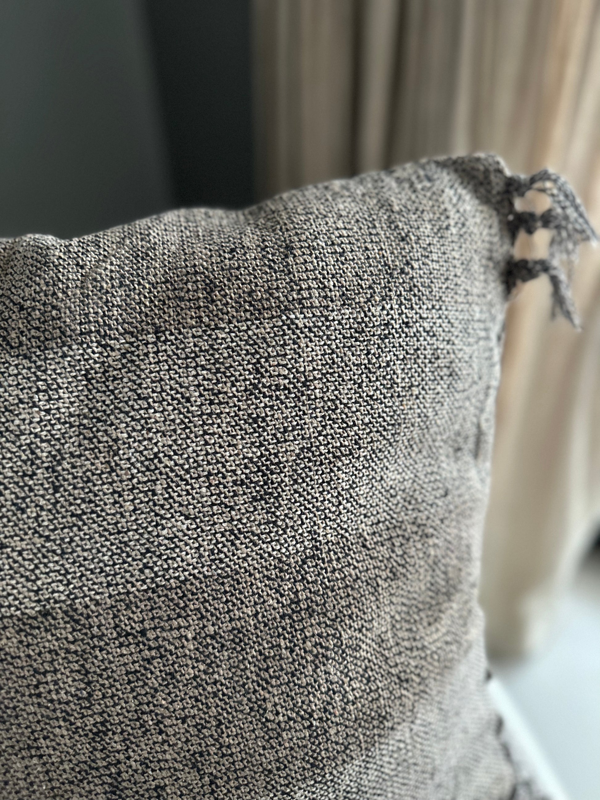 De bruin/grijze look geeft een warme toevoeging aan uw interieur. Het kussen heeft mooie franjes aan weerszijden. Maat 50x50cm.