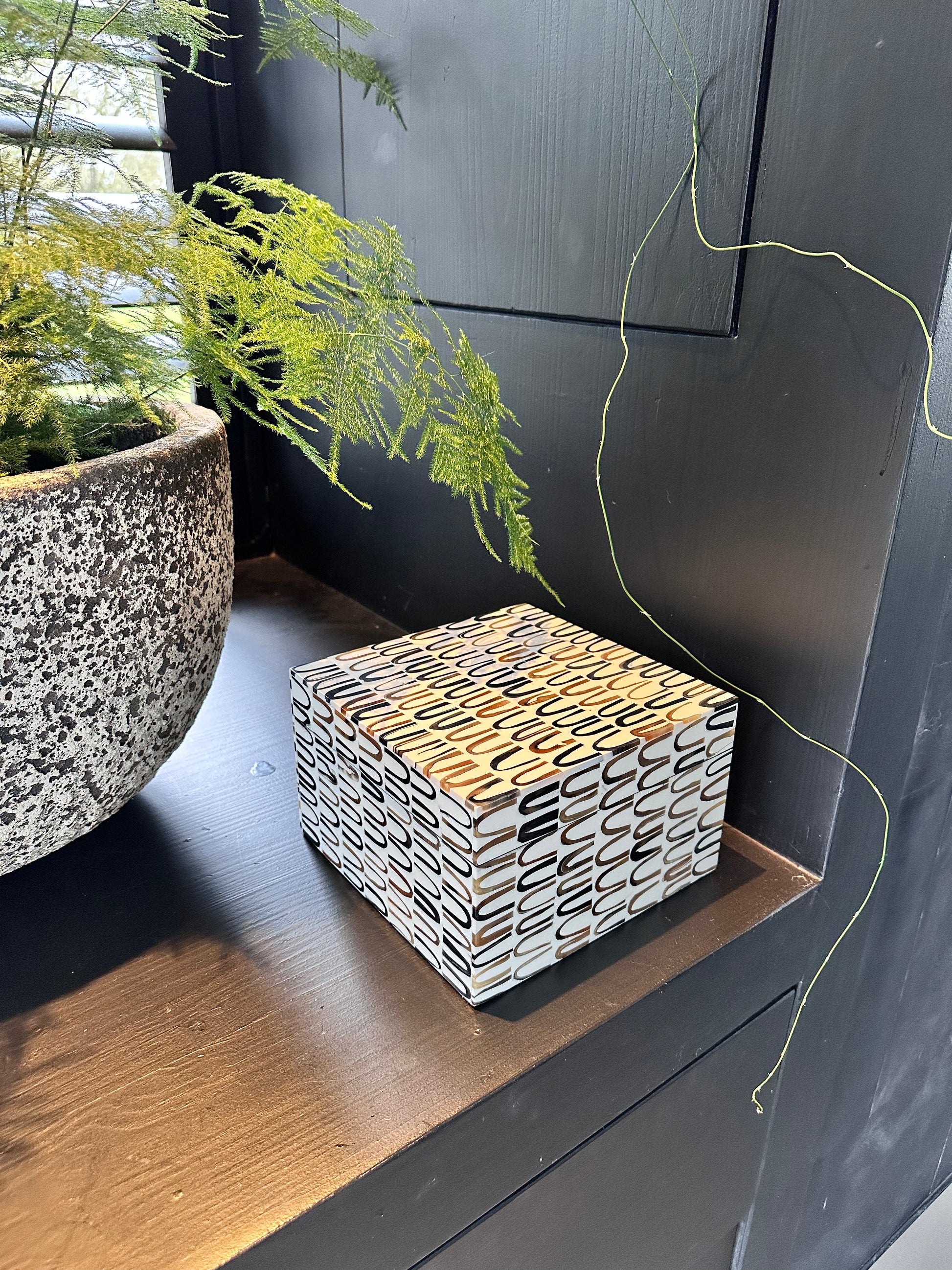 Mooie opbergdoos van Diga Colmore; maat 20x20x13, kleur zwart/wit/ecru/zand.