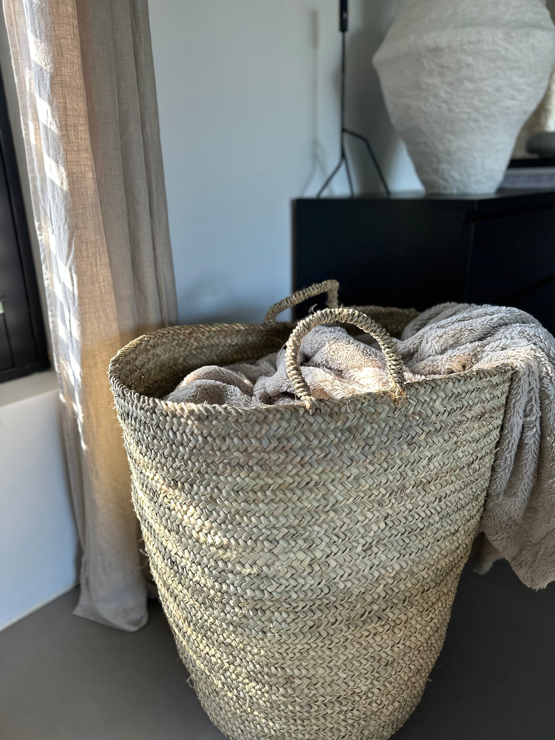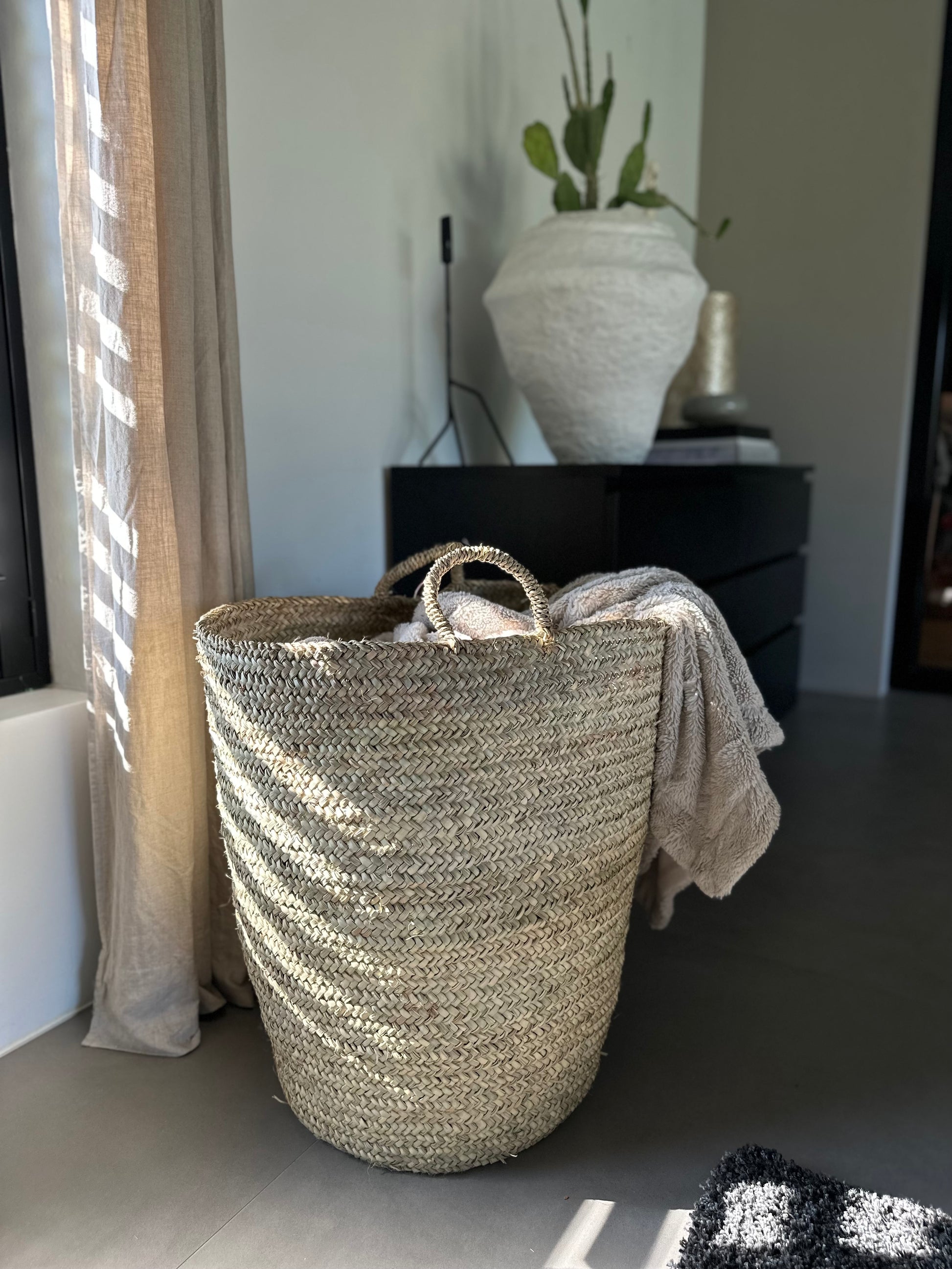 Deze mand voegt een vleugje mediterrane charme toe aan elk interieur. Tijdloos, stoer en handig voor het opbergen van diverse items zoals kussens, kleden of speelgoed.