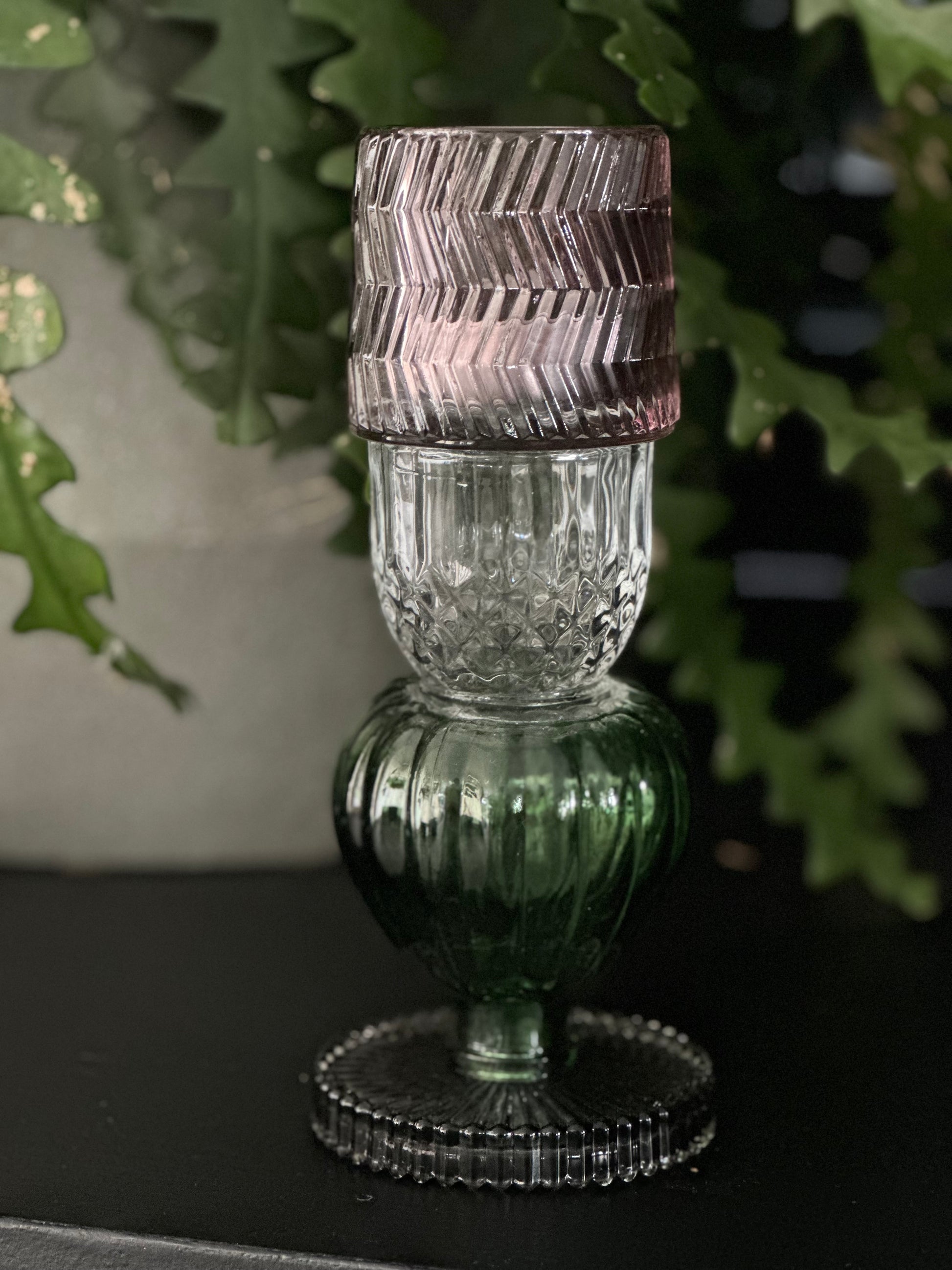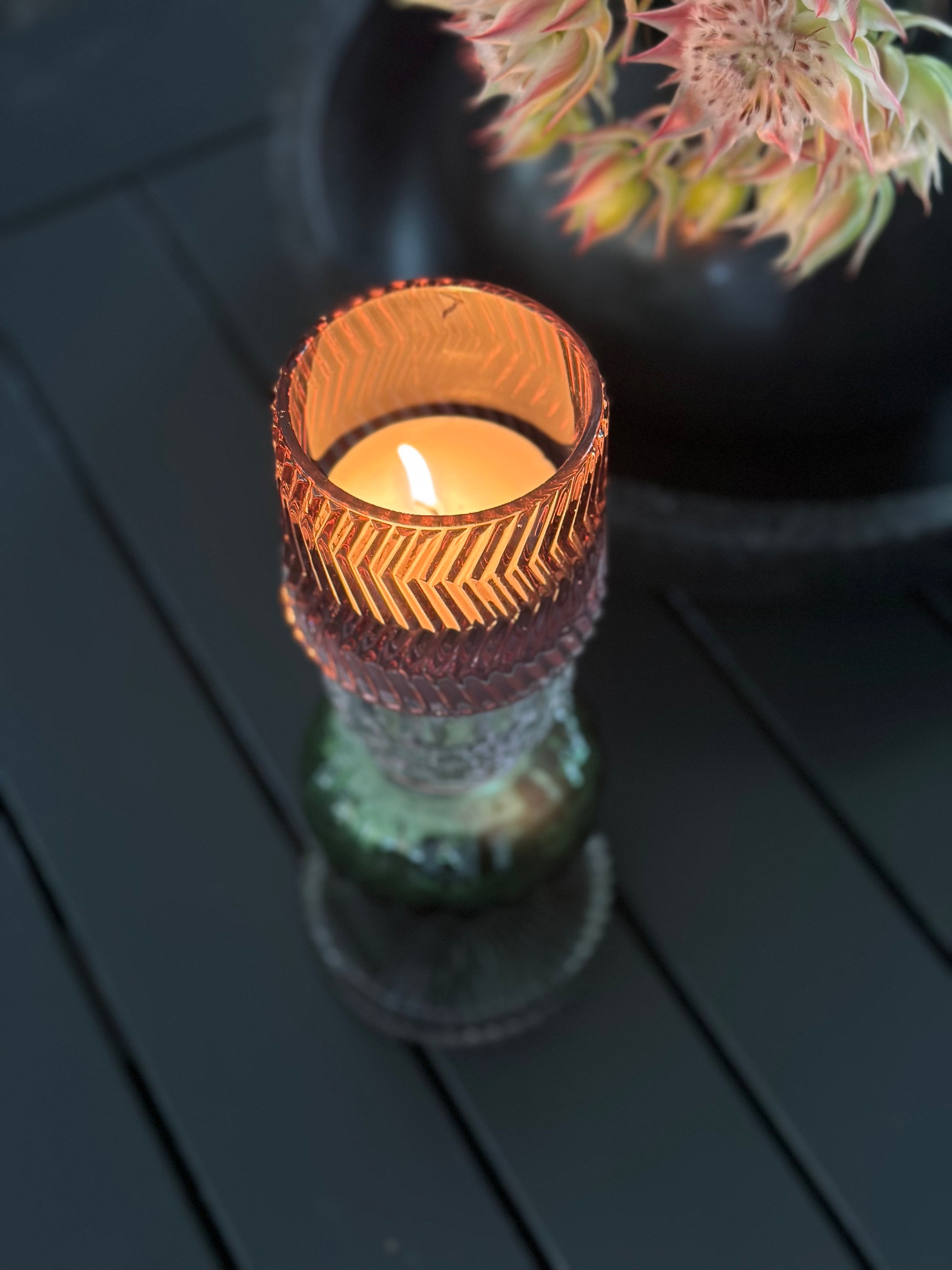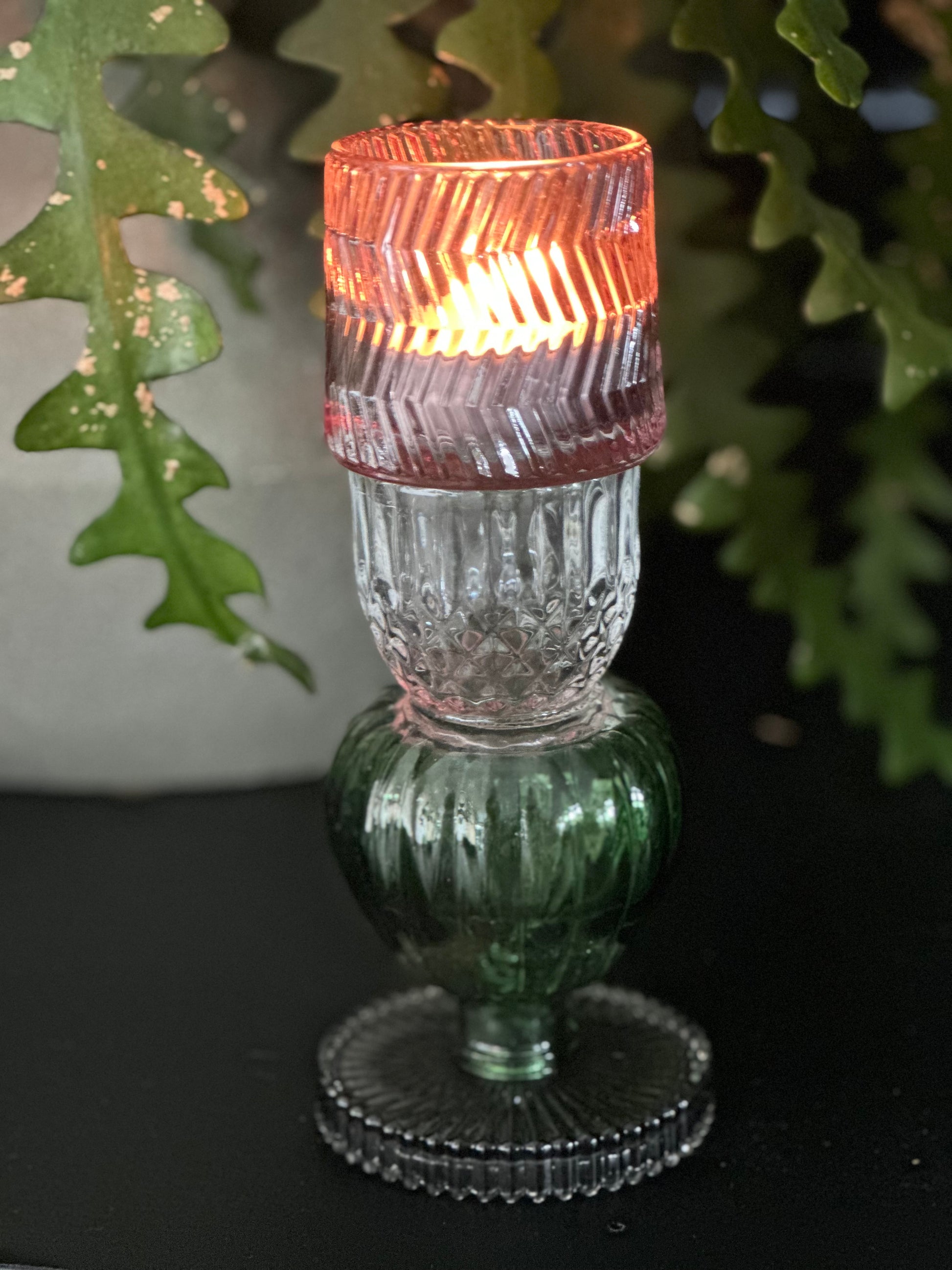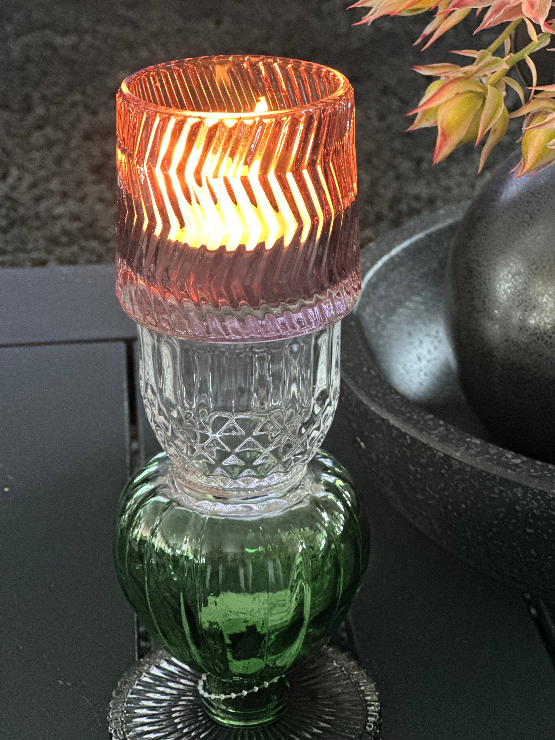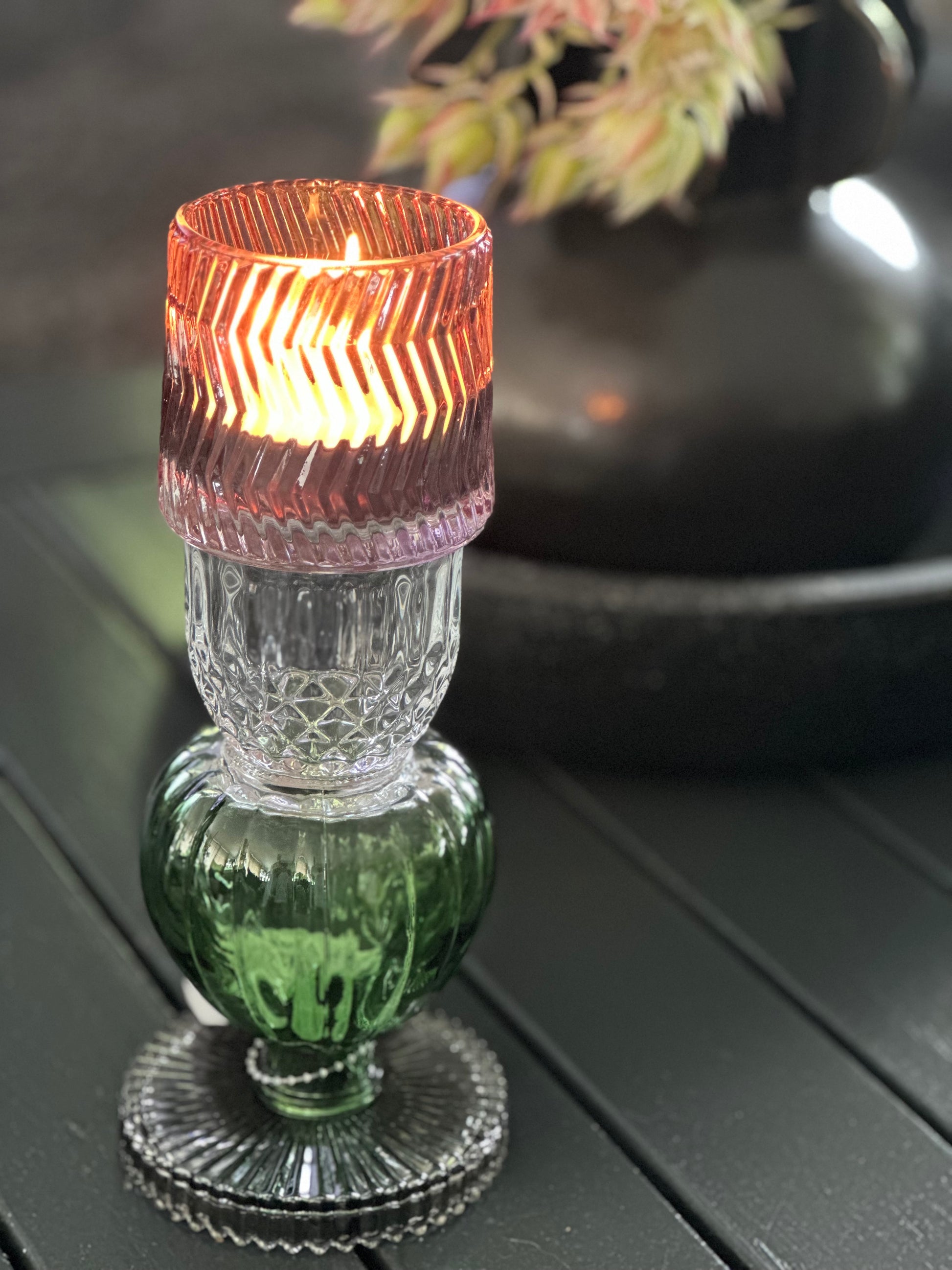 De transparante kleuren vangen prachtig het licht en creëren met een waxinelichtje een warme en levendige gloed. Uniek detail: je kunt deze kandelaar ook omgekeerd gebruiken – zet er een kaars op en je hebt een andere sfeer.