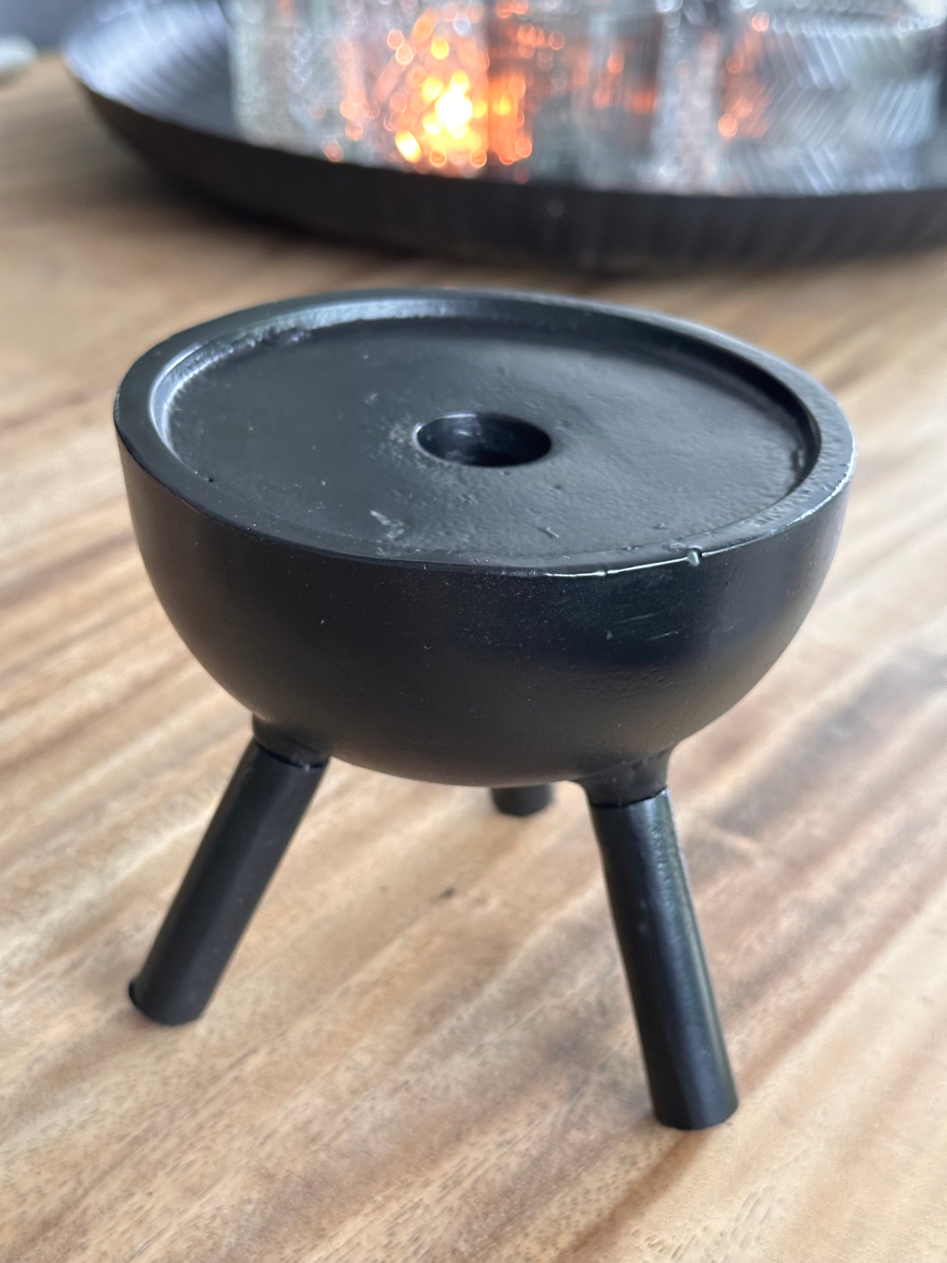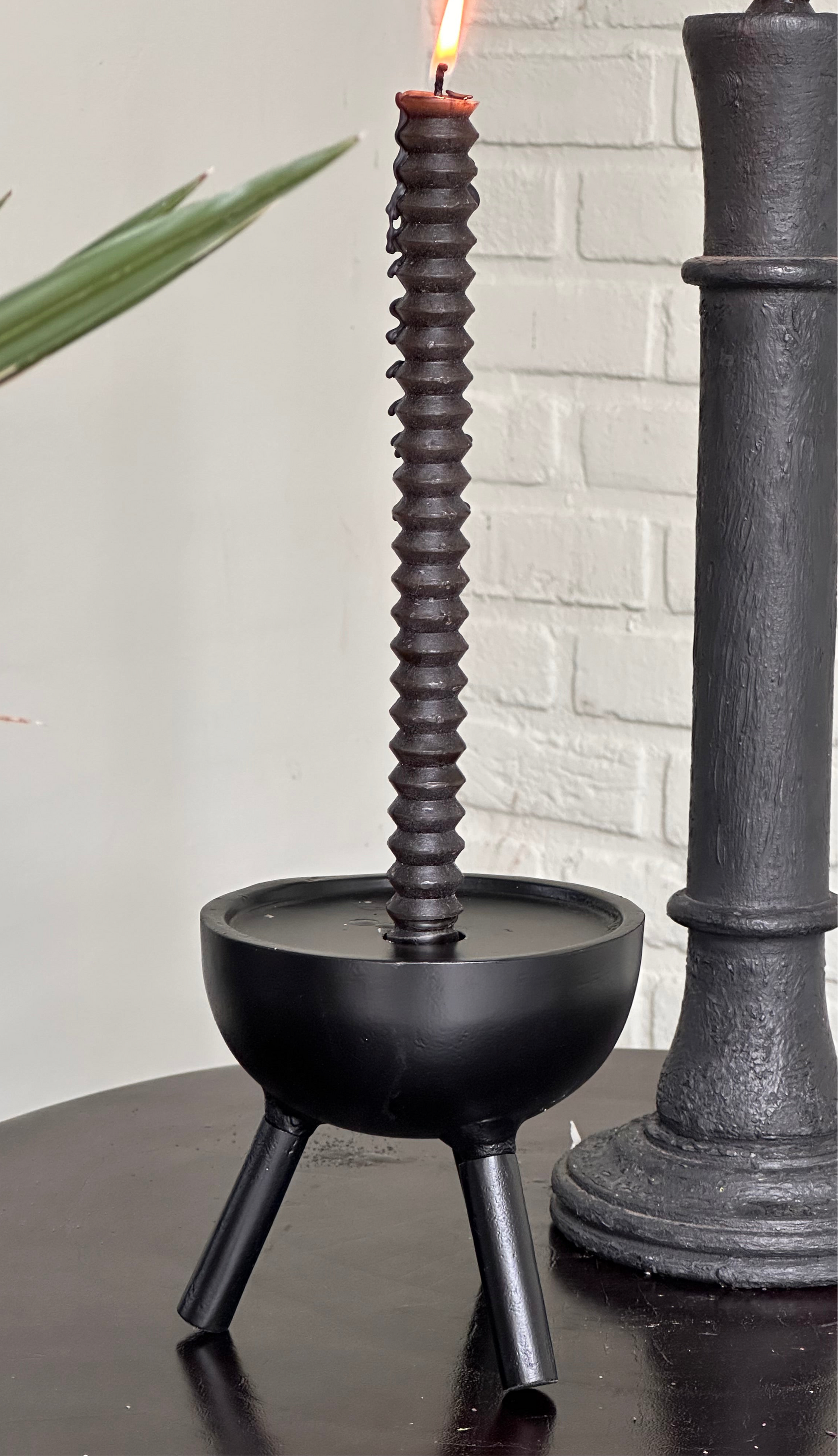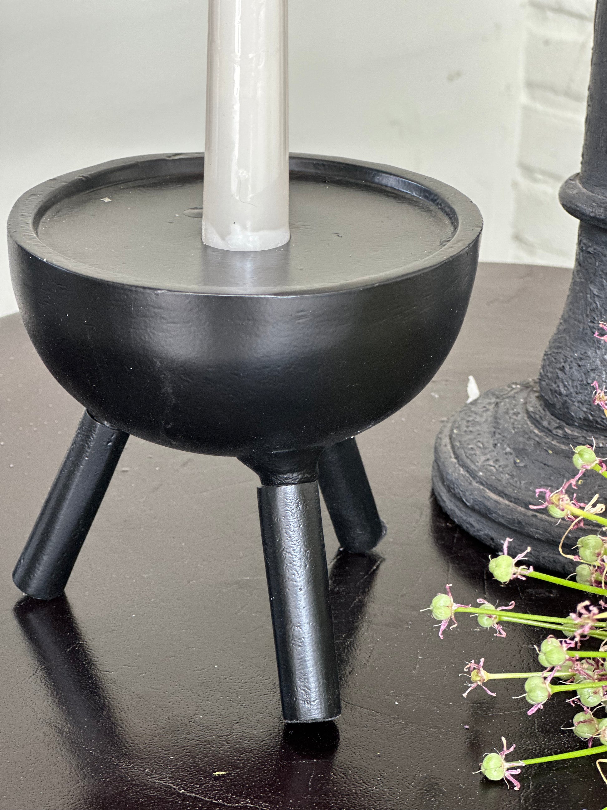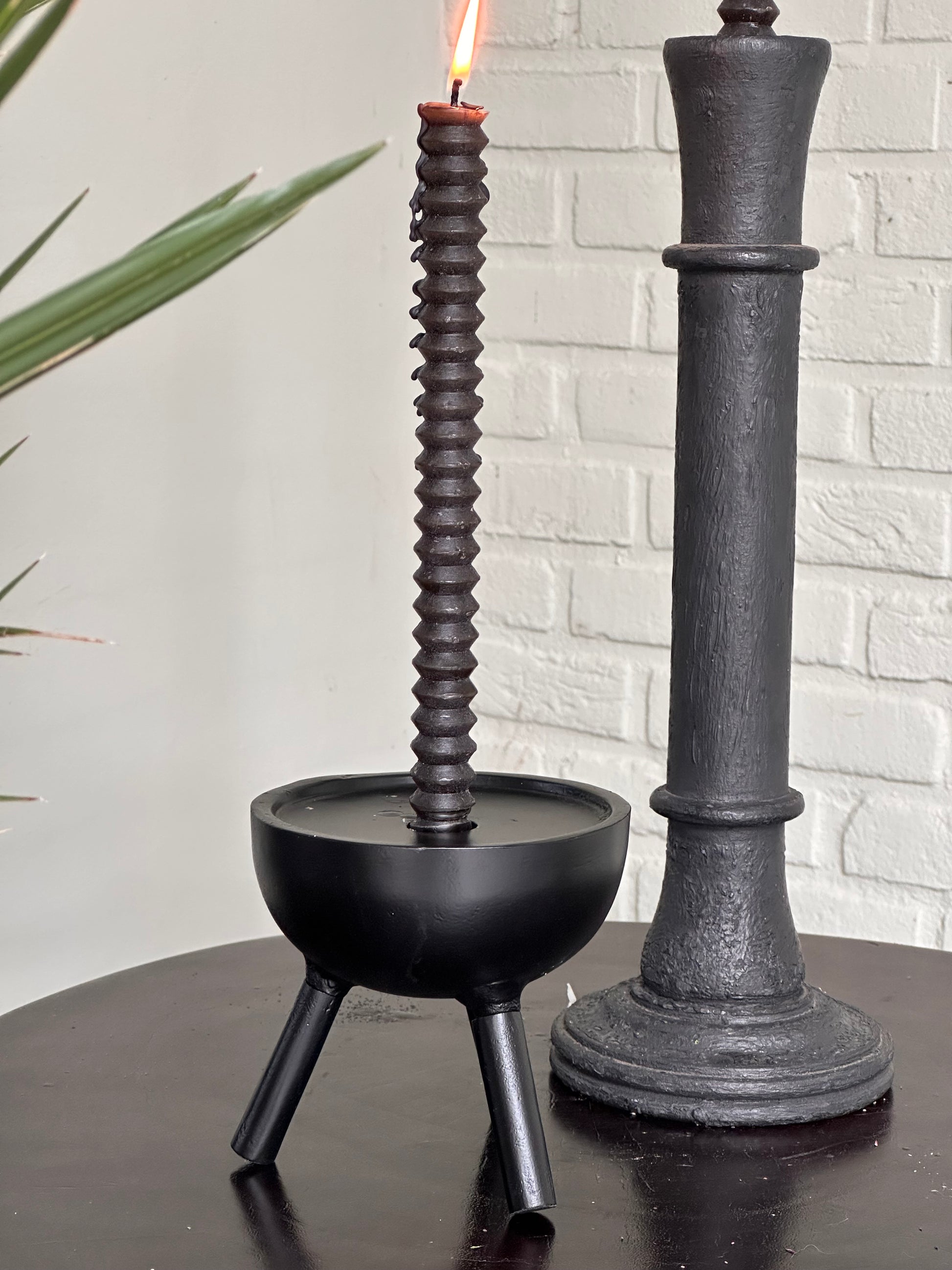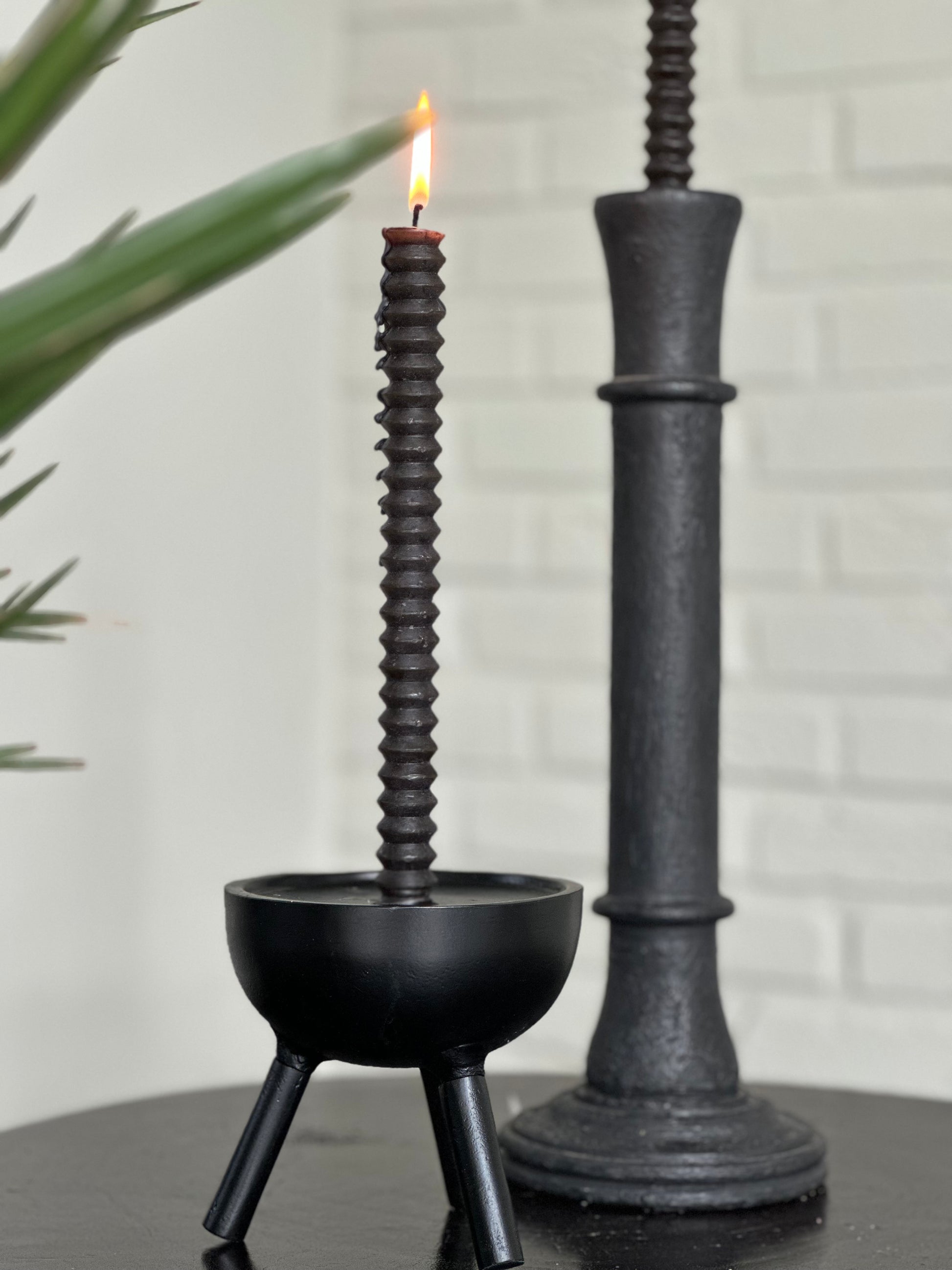 Deze moderne kandelaar van zwart aluminium combineert eenvoud met elegantie. Het ontwerp met drie poten zorgt voor een stabiele basis en een minimalistische uitstraling. Geschikt voor zowel een lange dinerkaars als een stompkaars – jij kiest de sfeer.