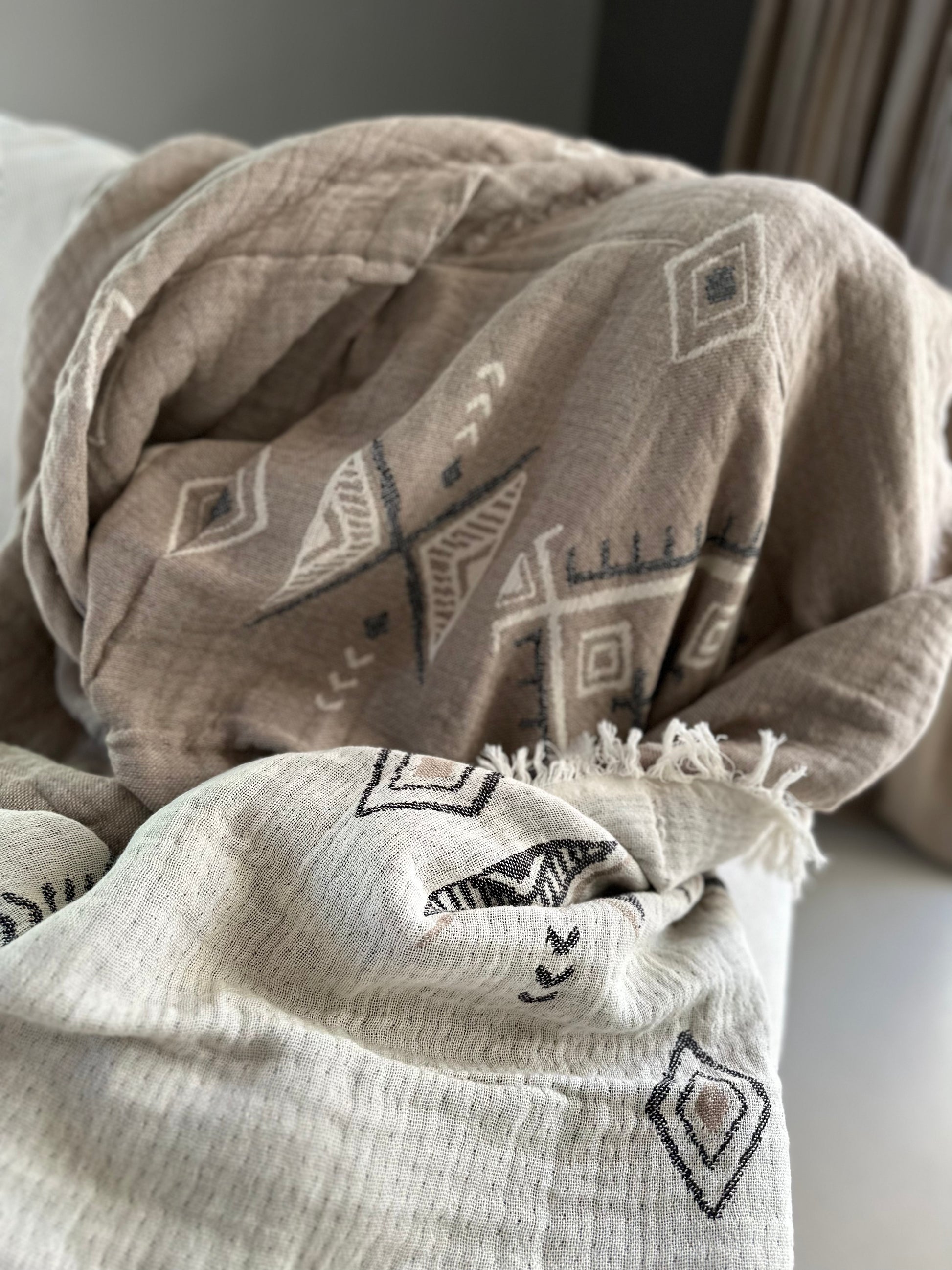 Wat het uiteindelijk nog mooier maakt is dat deze plaid van 100% katoen een dubbelzijdig ontwerp heeft! Met twee zijden in verschillende kleuren kies jij welke sfeer je wilt en welke kleur bij je stemming past.