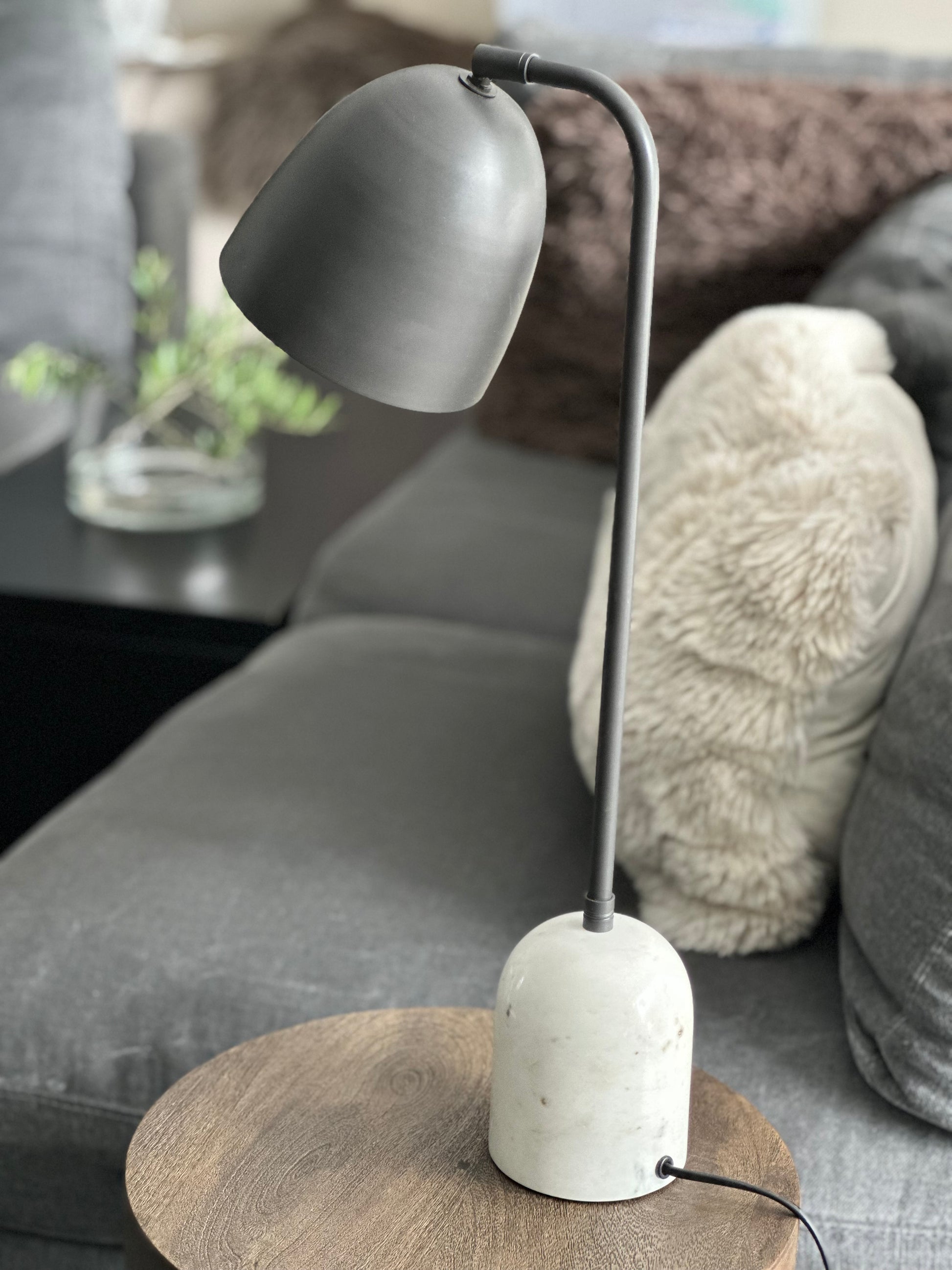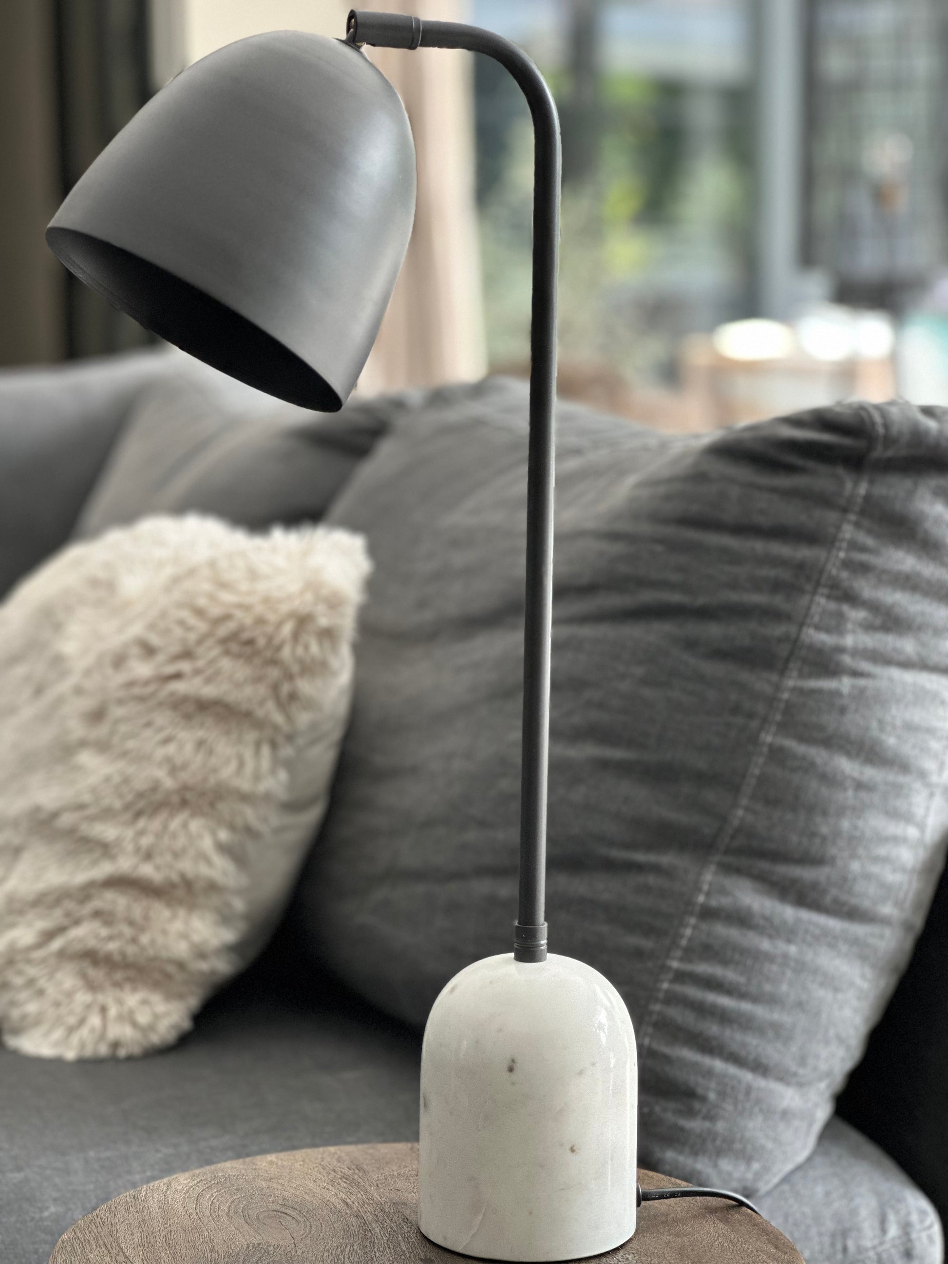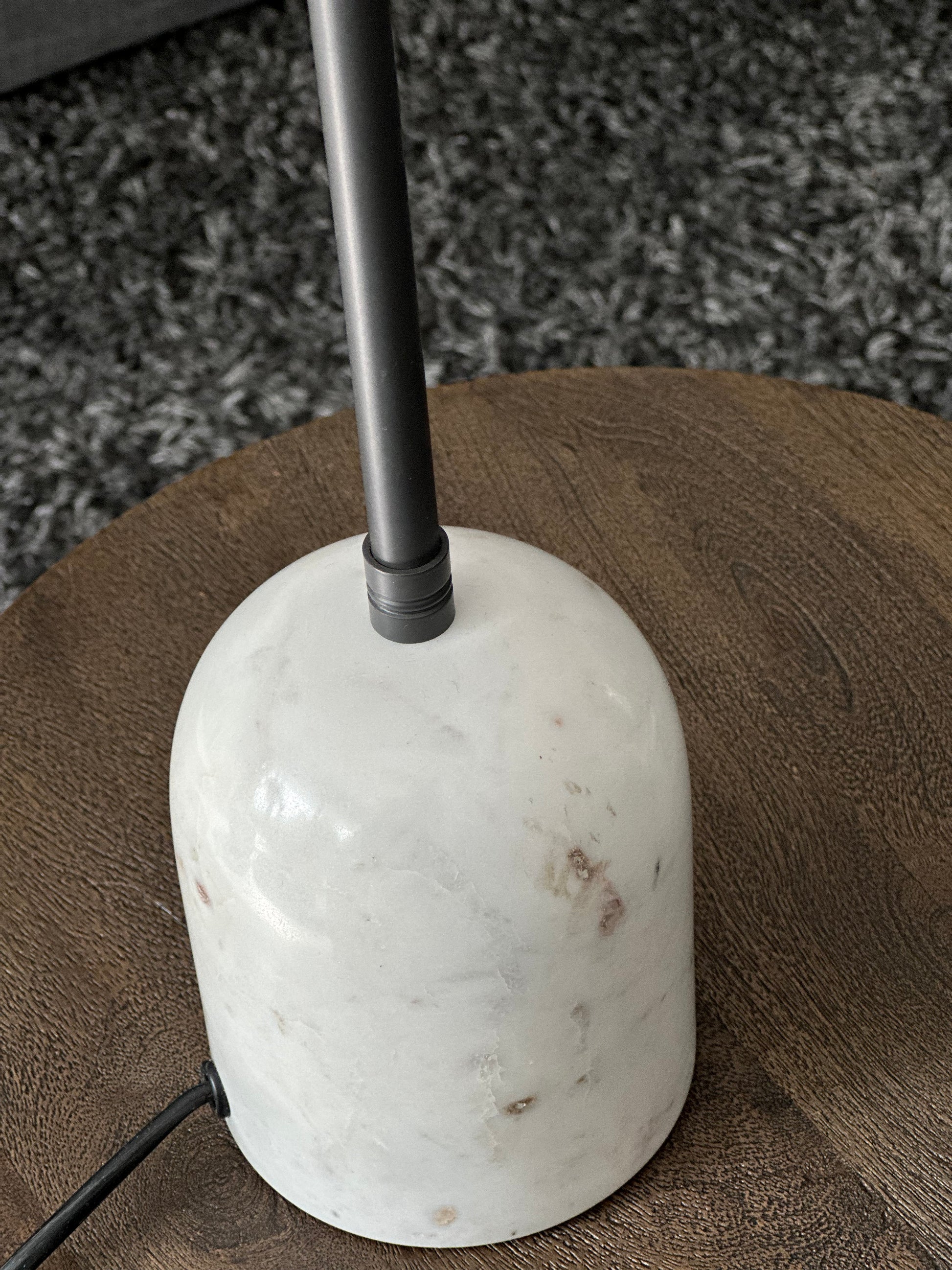 Breng sfeer en klasse in je interieur met deze elegante tafellamp. De lamp combineert tijdloze materialen met een moderne uitstraling. De stevige, massieve voet is gemaakt van echt marmer – een natuurproduct dat elke lamp uniek maakt. Het slanke armatuur is uitgevoerd in antracietkleurig staal voor een strakke, industriële look.